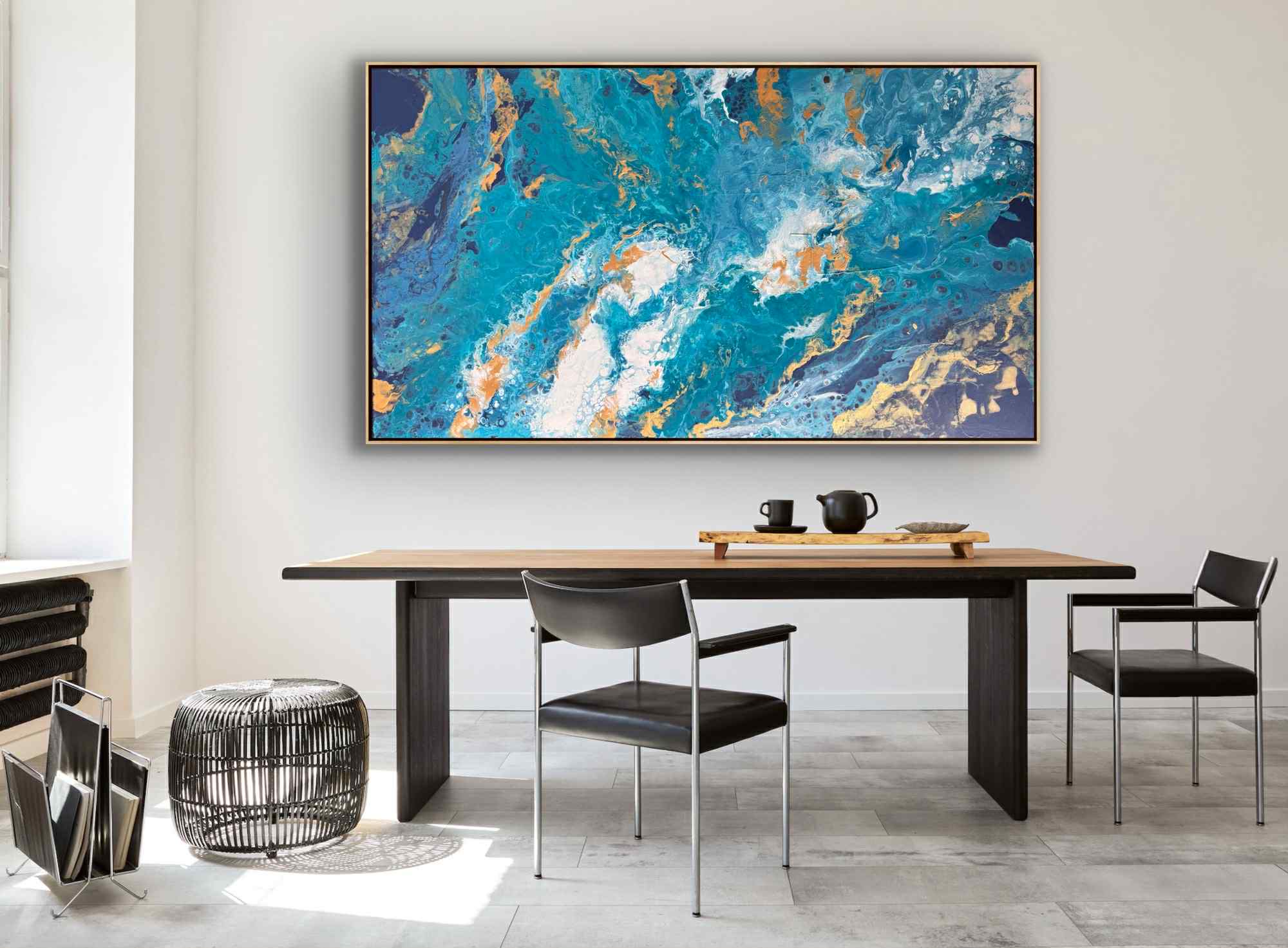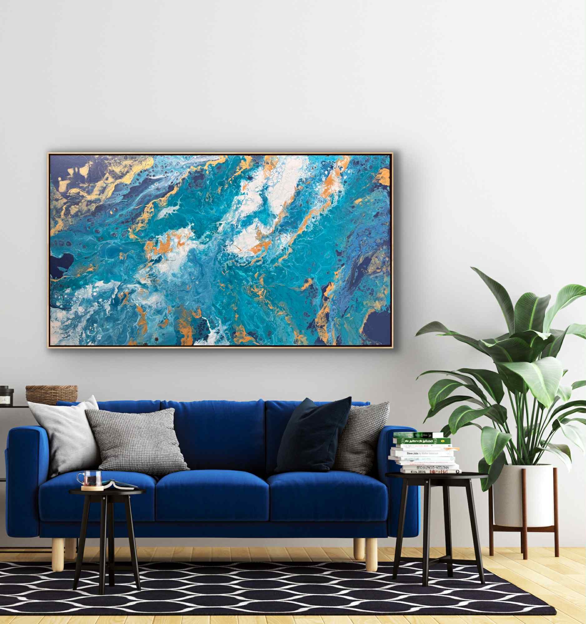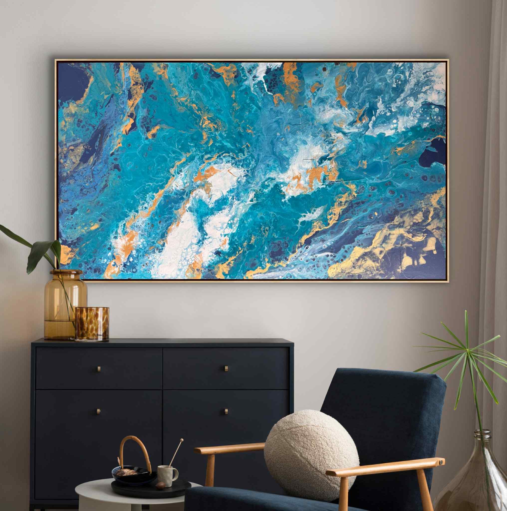Obraz przedstawia abstrakcyjną, panoramiczną kompozycję inspirowaną żywiołem wody. Dominują w nim intensywne odcienie turkusu, błękitu i głębokiego granatu, które płynnie przenikają się i wirują, tworząc wrażenie ruchu oraz głębi. Całość przypomina wzburzone fale oceanu widziane z lotu ptaka lub fragment kamienia szlachetnego przeciętego na pół, odsłaniającego bogactwo struktur.