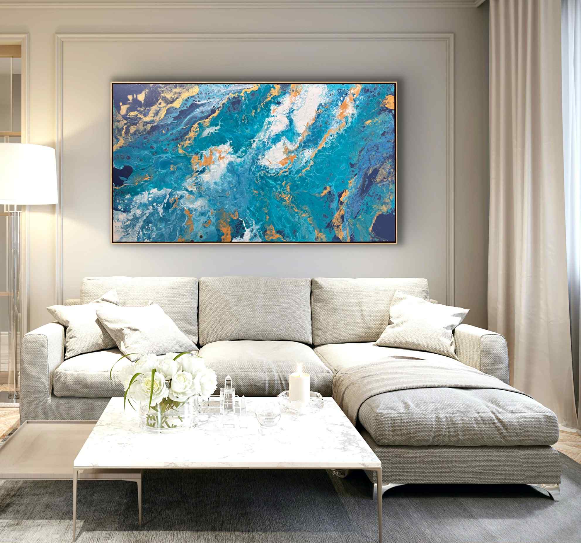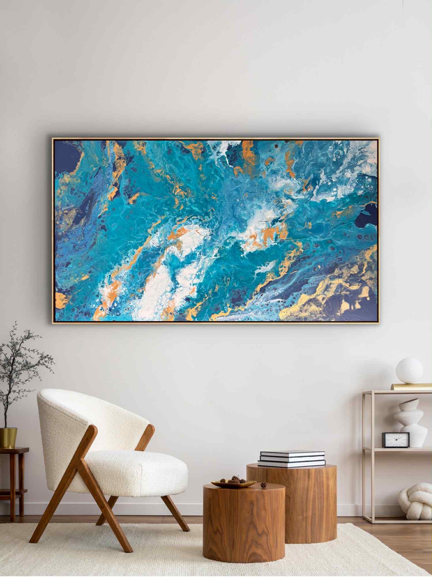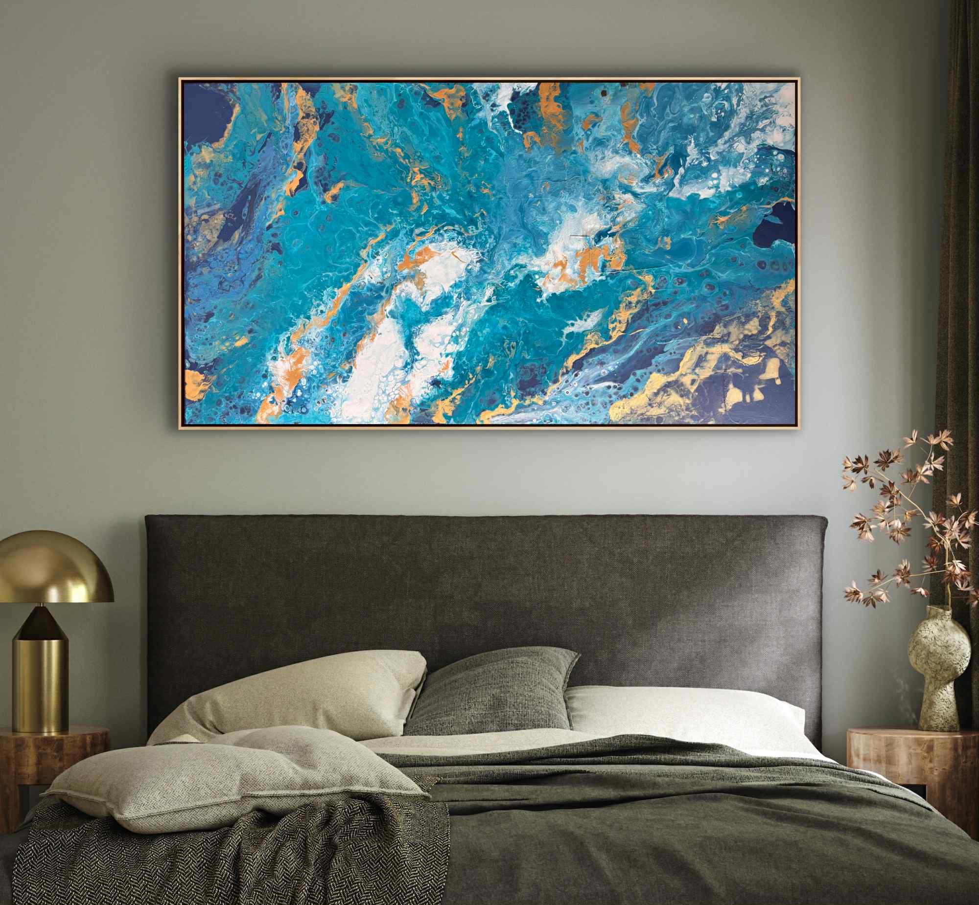 Obraz przedstawia abstrakcyjną, panoramiczną kompozycję inspirowaną żywiołem wody. Dominują w nim intensywne odcienie turkusu, błękitu i głębokiego granatu, które płynnie przenikają się i wirują, tworząc wrażenie ruchu oraz głębi. Całość przypomina wzburzone fale oceanu widziane z lotu ptaka lub fragment kamienia szlachetnego przeciętego na pół, odsłaniającego bogactwo struktur.
