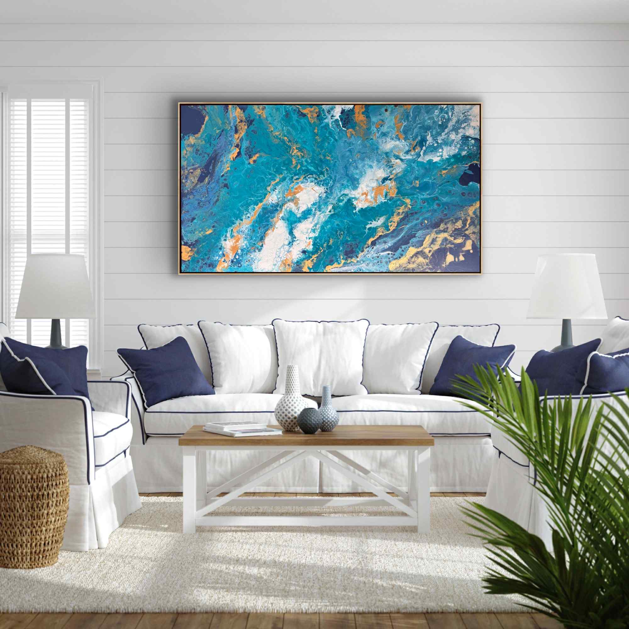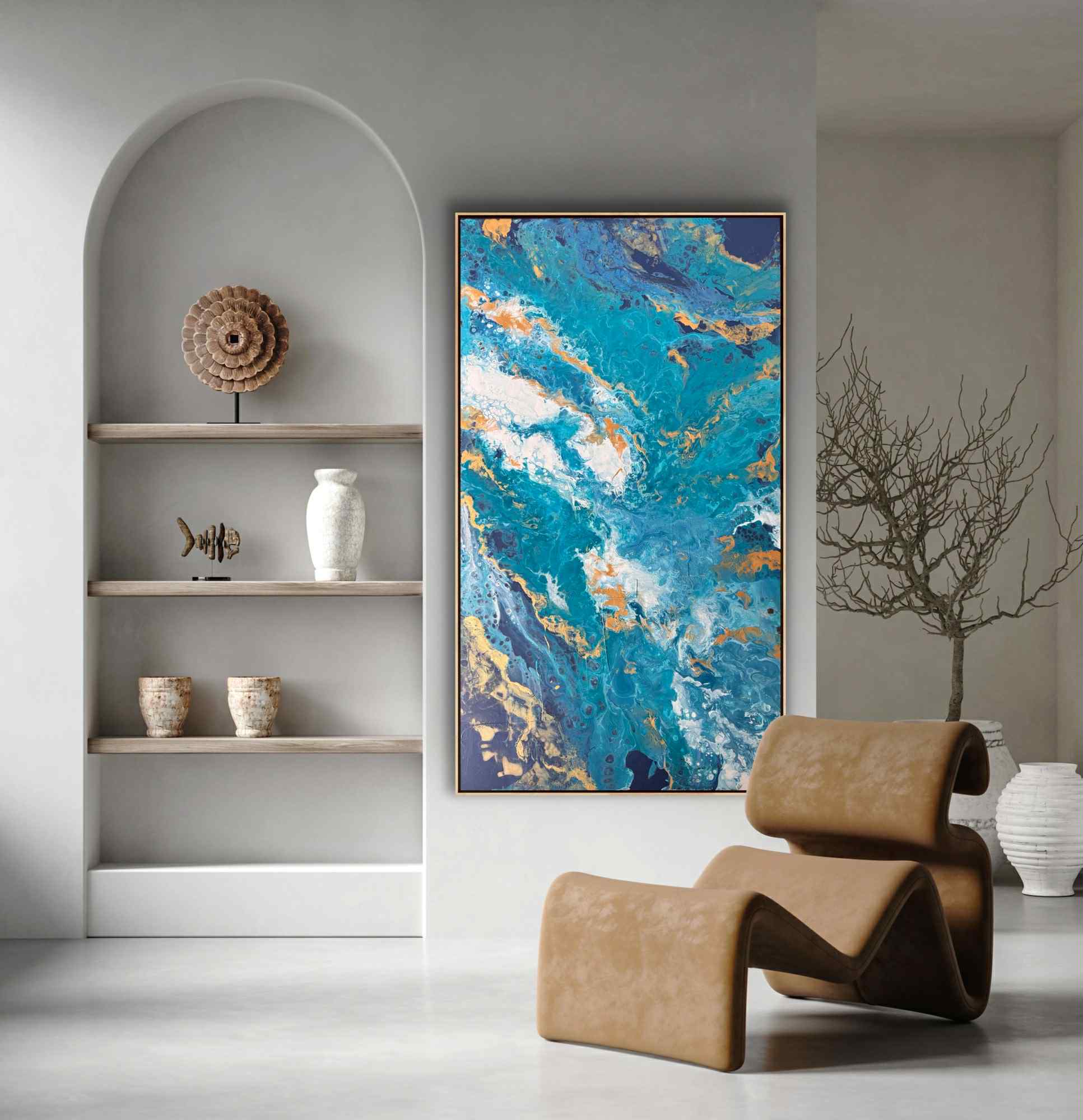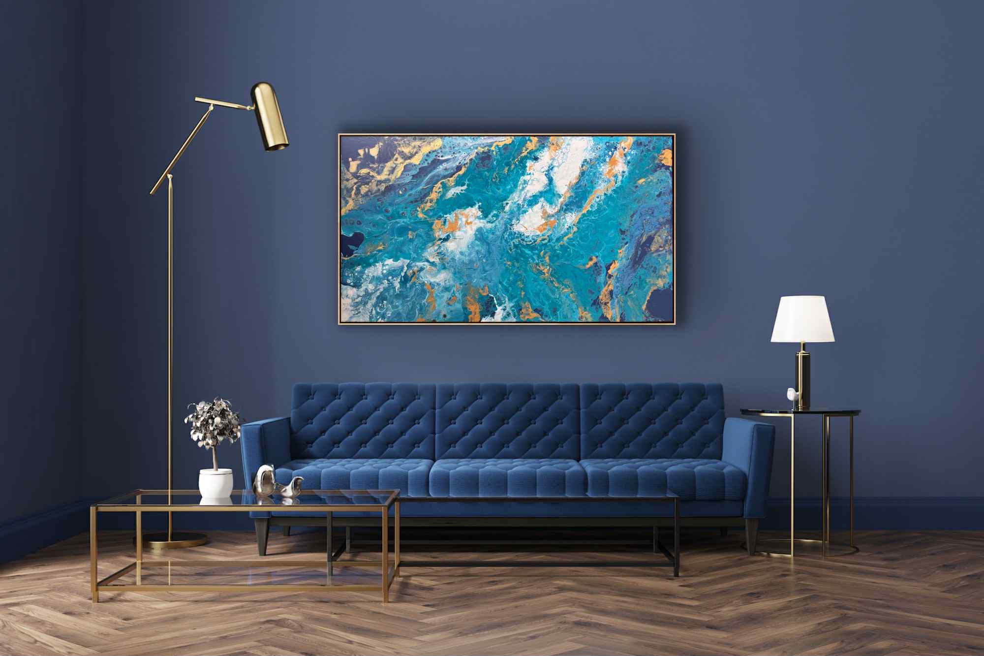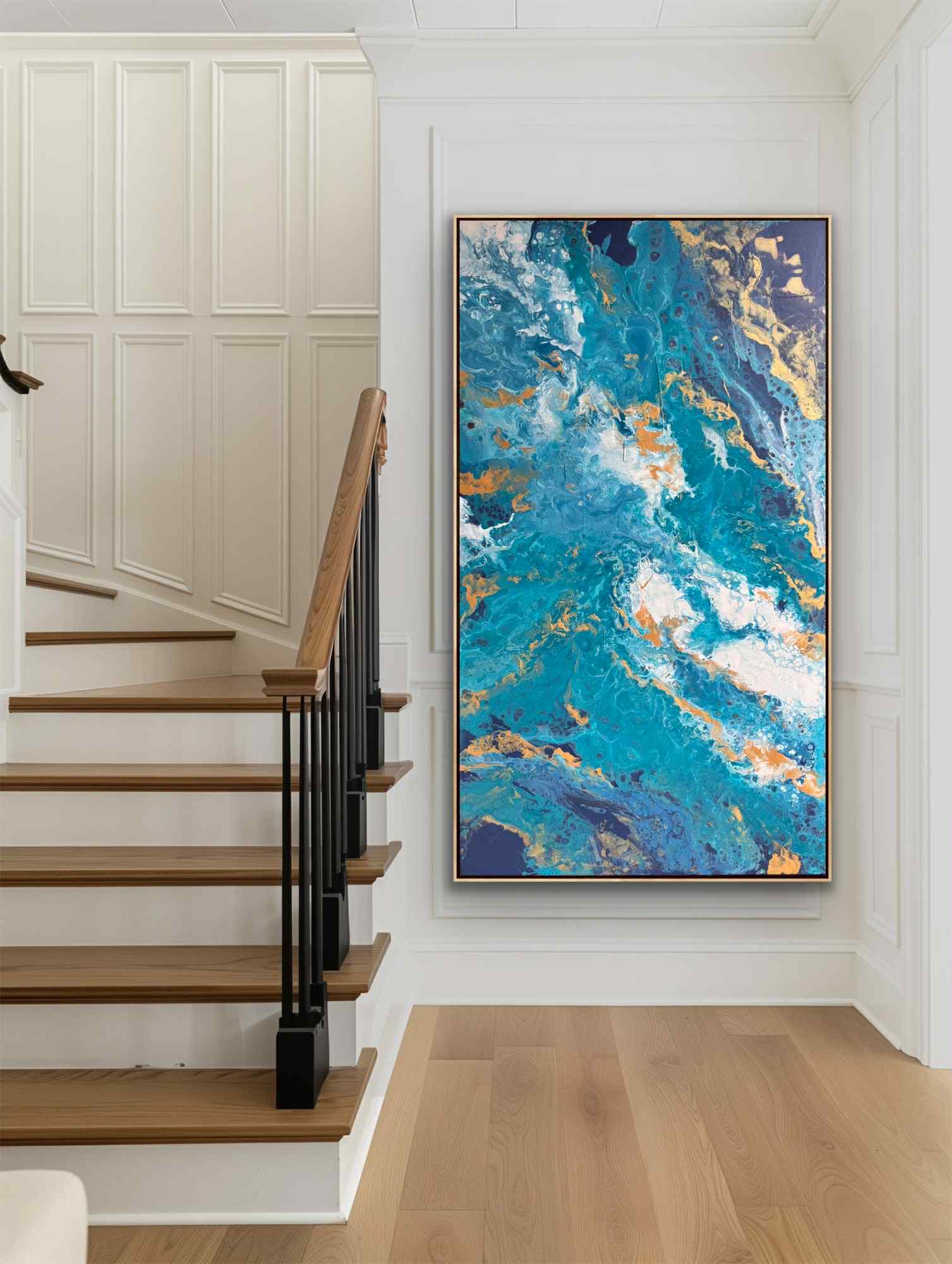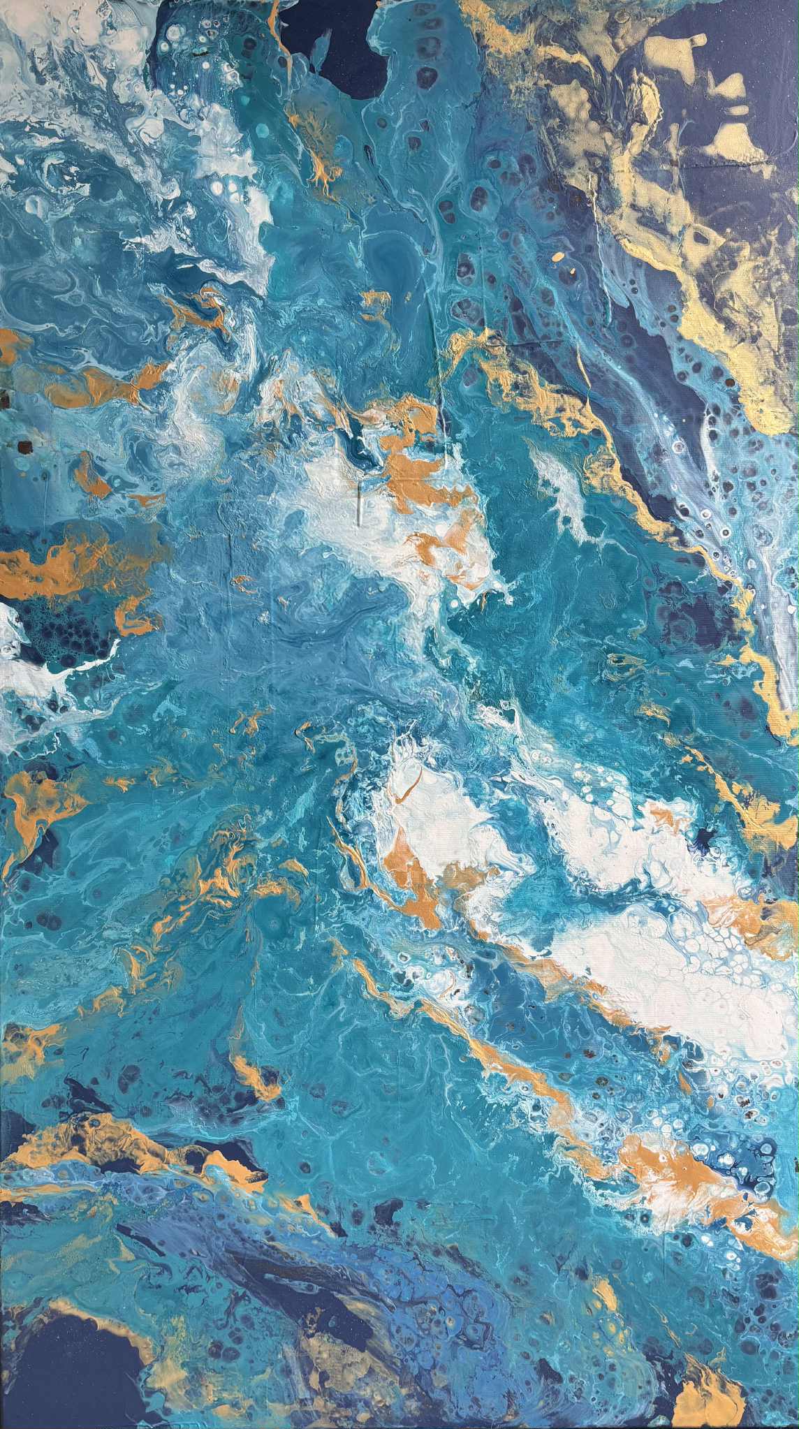 Przez chłodną gamę kolorystyczną przebijają się nieregularne żyły złota i ciepłej ochry. Te złociste akcenty dodają kompozycji elegancji i światła, kontrastując z chłodem błękitów. W niektórych miejscach farba tworzy efekt delikatnych „komórek” i spękań, co nadaje powierzchni organiczny, niemal mineralny charakter. Centralna część obrazu jest jaśniejsza – pojawiają się tam biele i rozbielone turkusy, które budują wrażenie piany morskiej lub rozświetlonej głębi.
