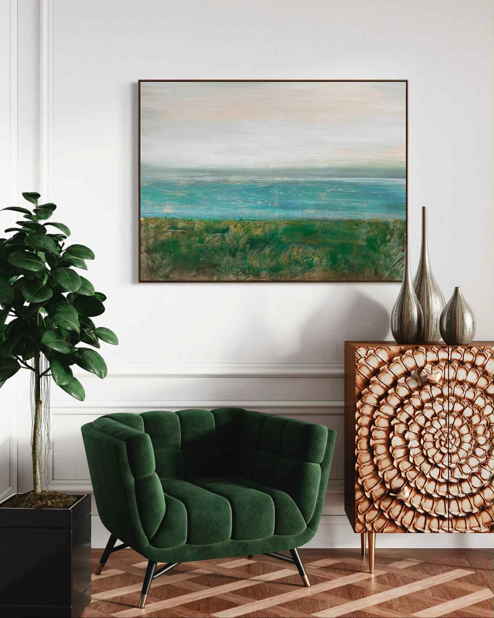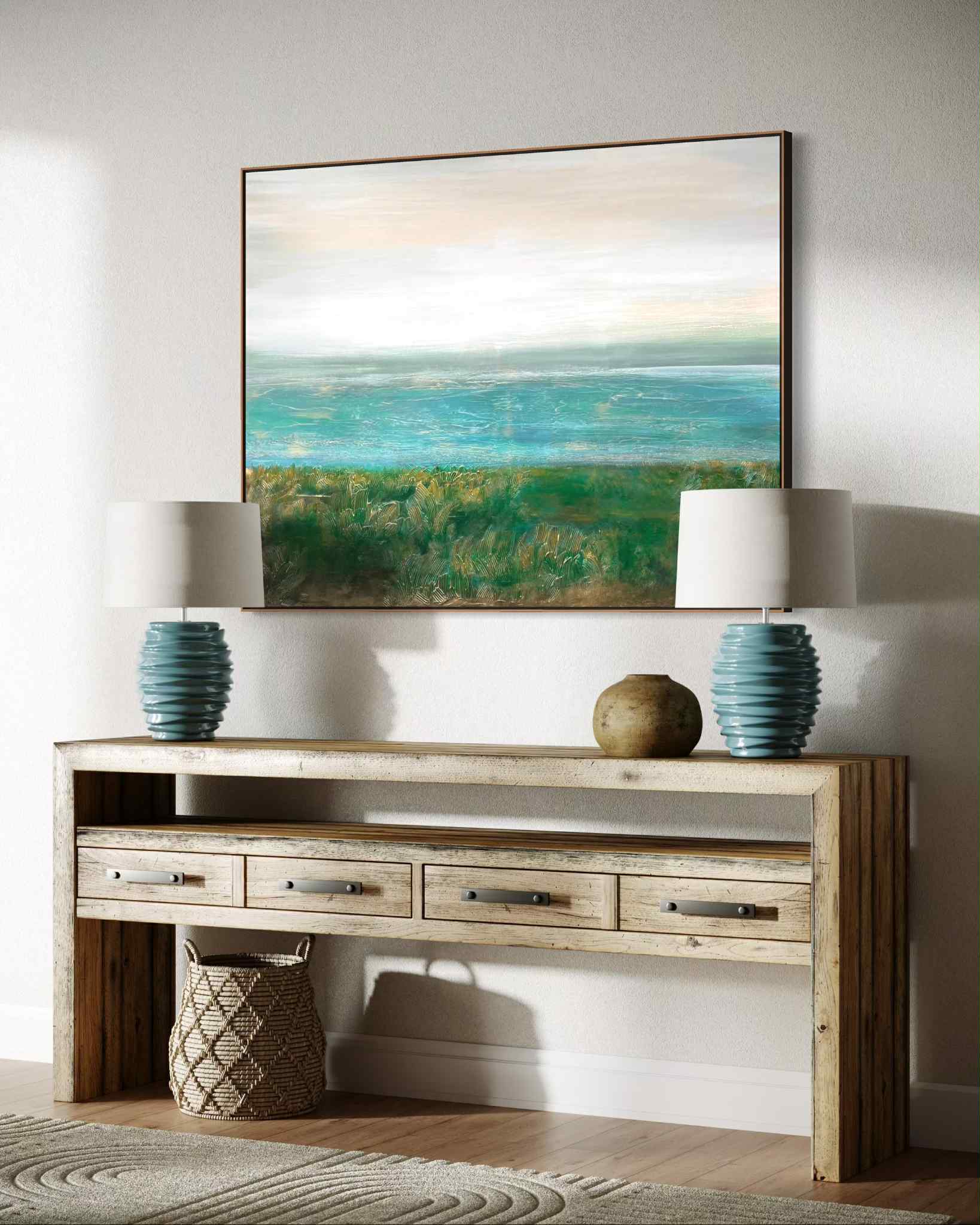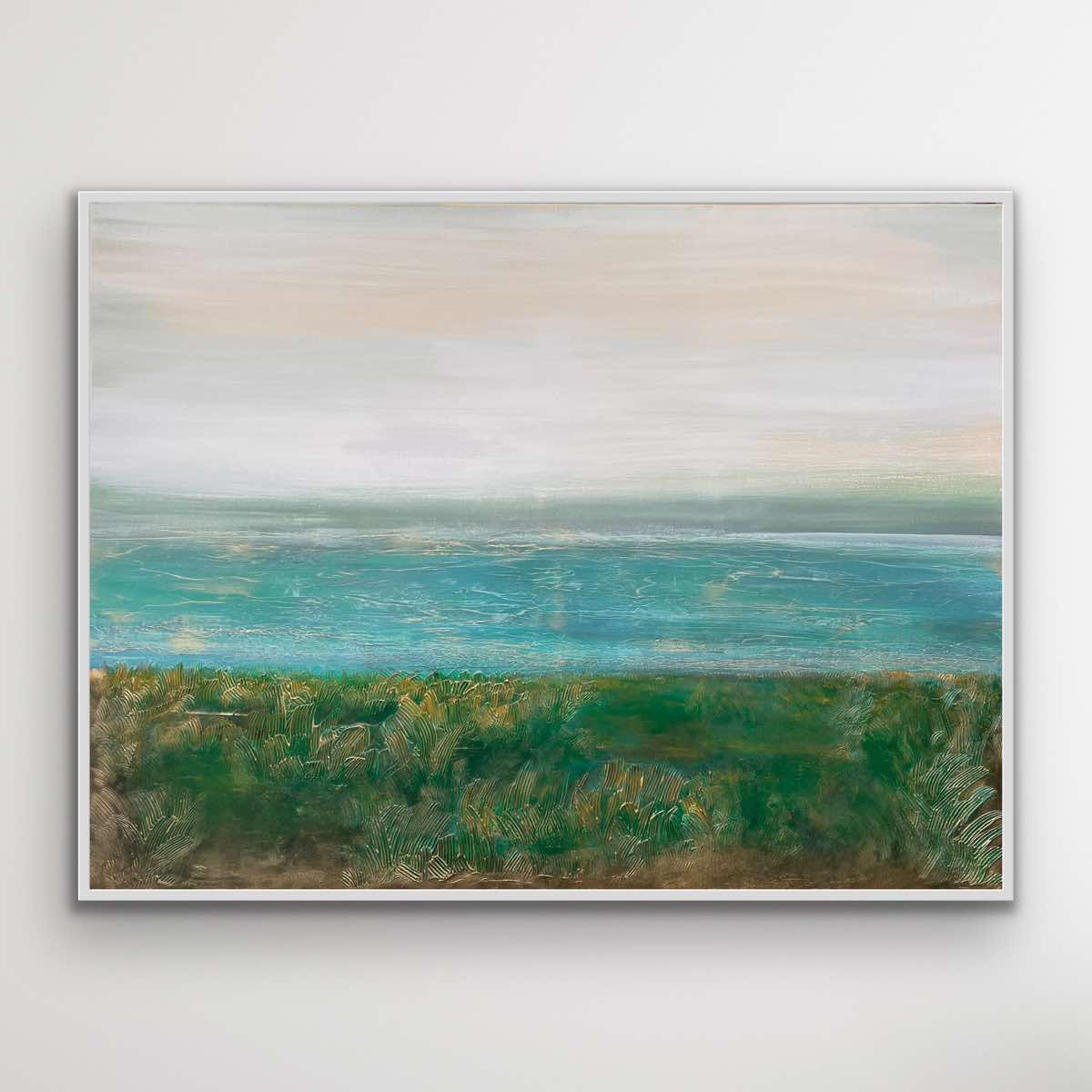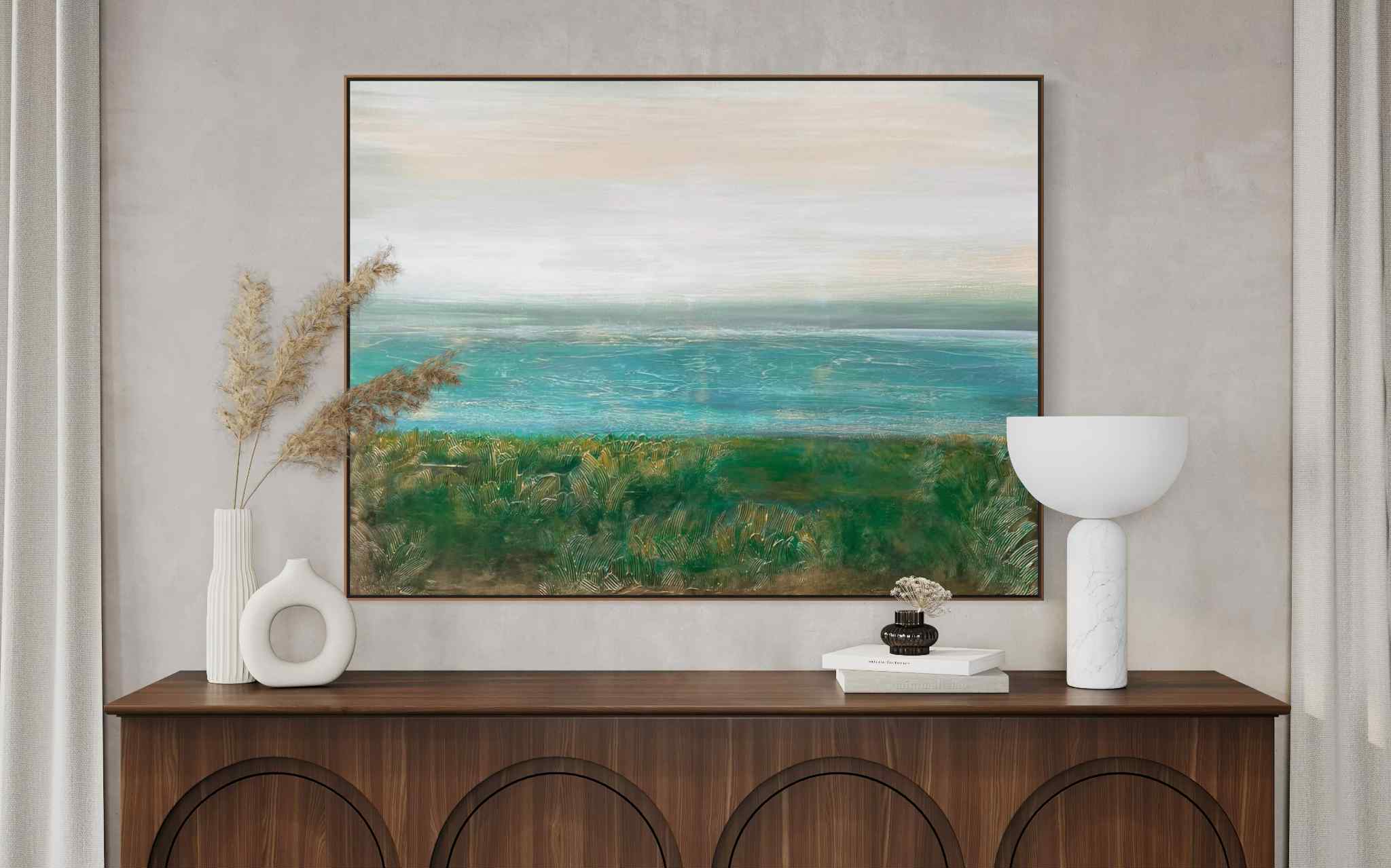 Obraz przedstawiający krajobraz wybrzeża w delikatnej turkusowej tonacji barw.