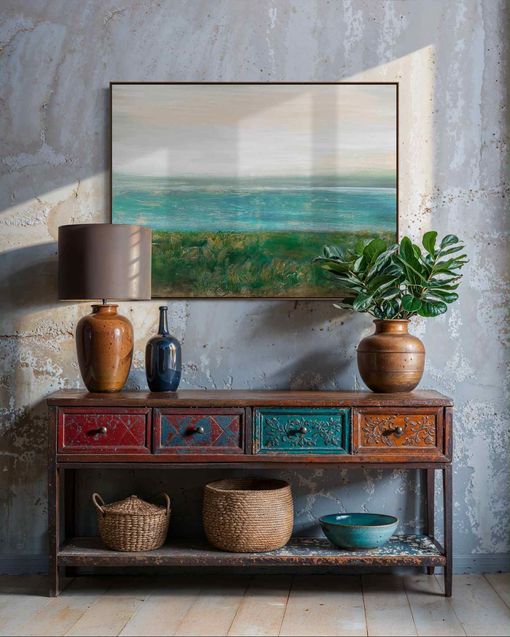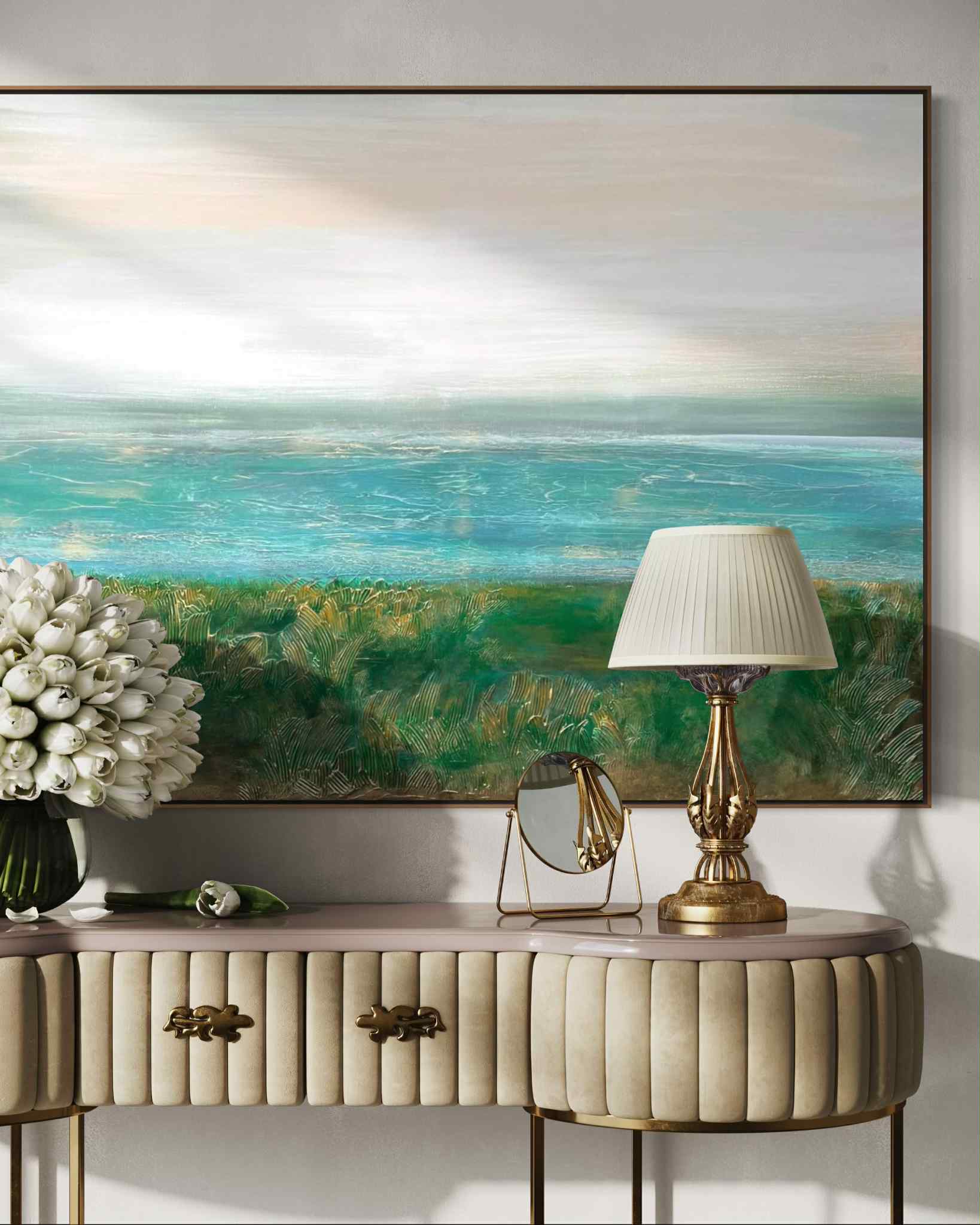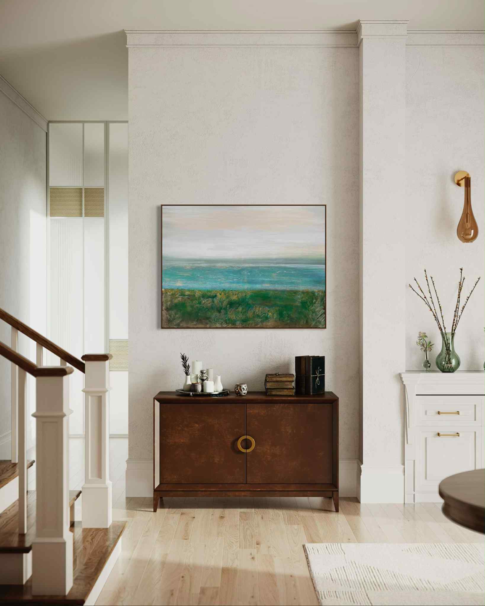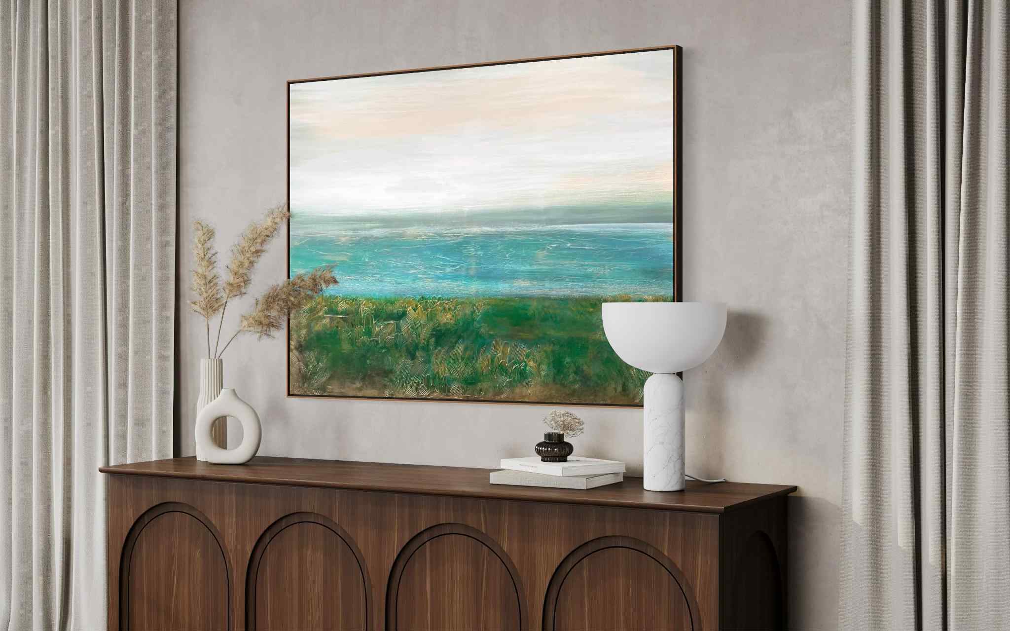 Obraz przedstawiający krajobraz wybrzeża w delikatnej turkusowej tonacji barw.