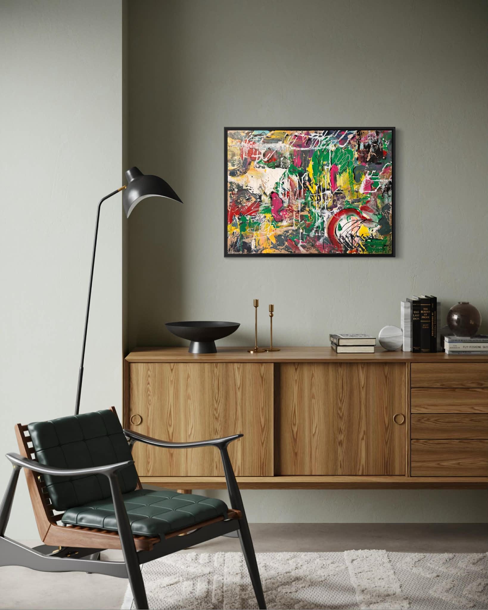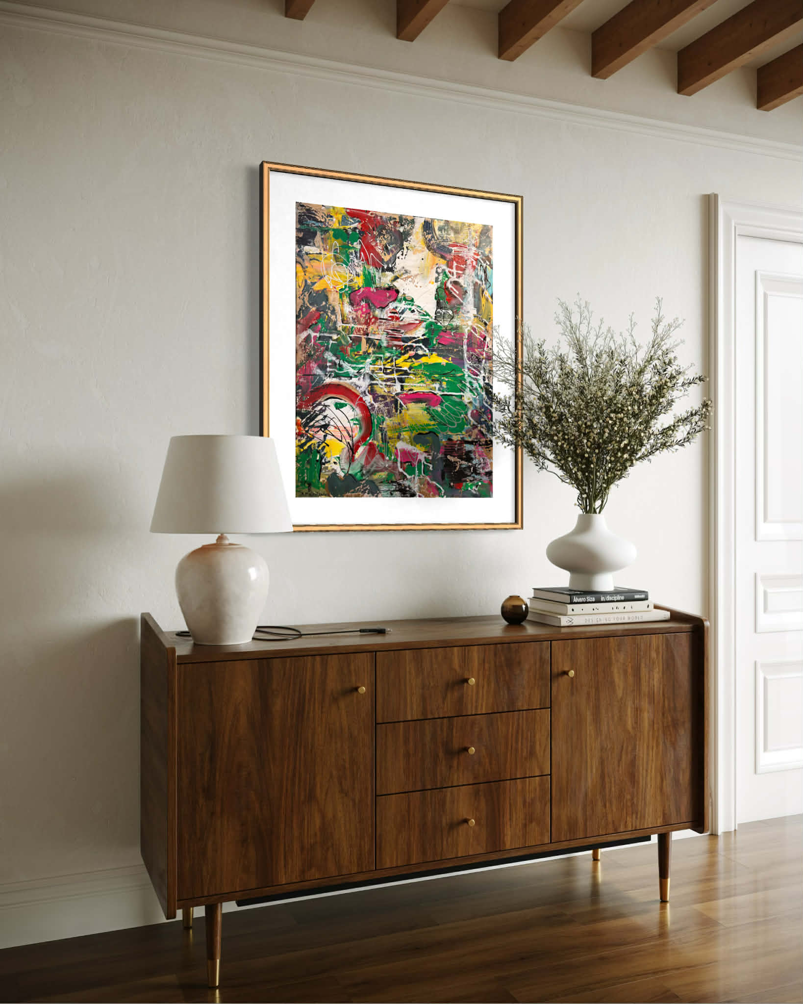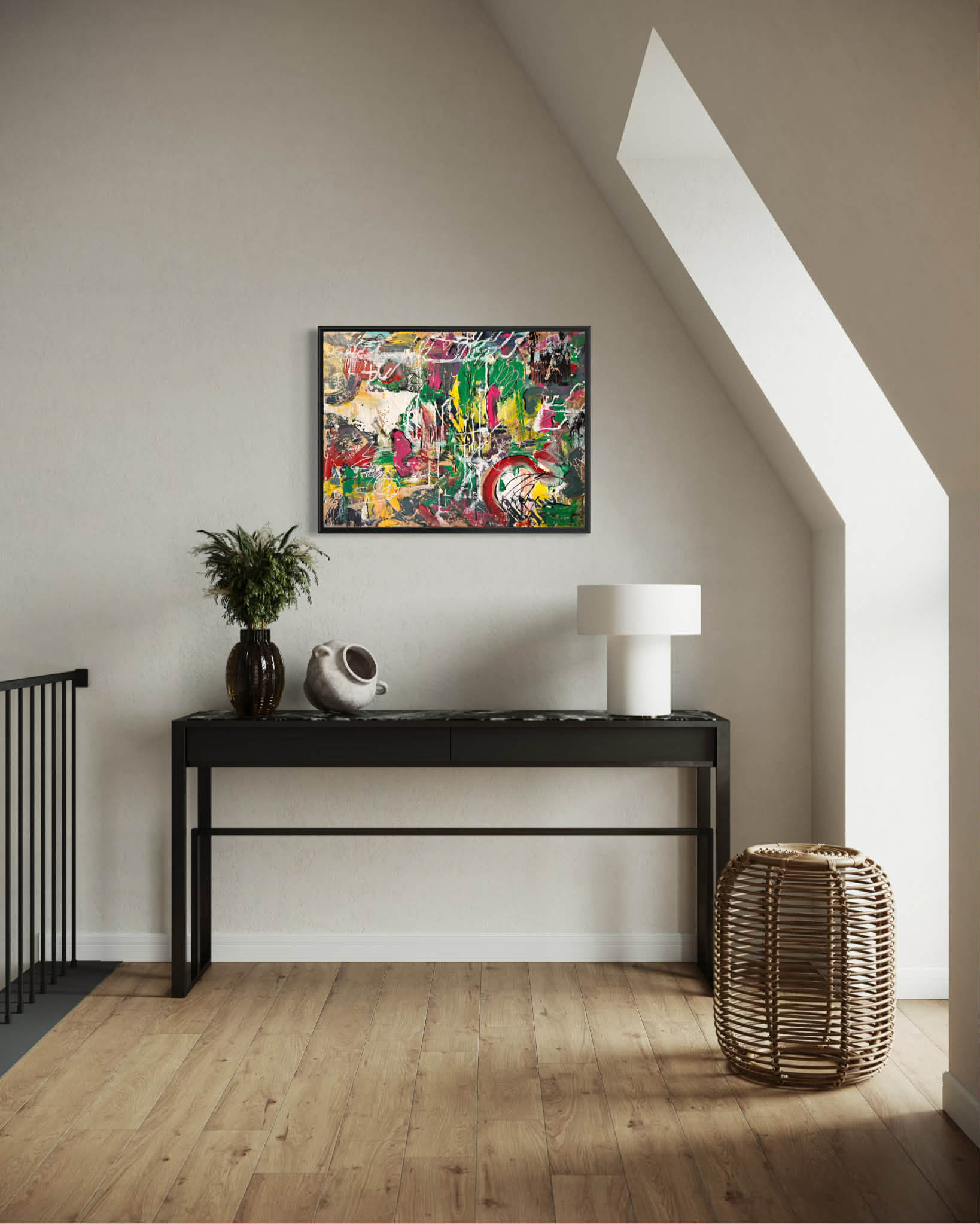 „Golden Flow” to abstrakcyjna kompozycja, w której ruch i światło stapiają się w harmonijną, niemal organiczną strukturę. Obraz zbudowany jest na przenikających się pasmach bieli, ciepłych szarości i beżów, przez które dynamicznie przepływają złote strugi. Te świetliste akcenty – gęstsze, miejscami niemal reliefowe – tworzą wrażenie płynnej energii, jakby rozświetlona rzeka przecinała kamienną materię. Artysta operuje efektem warstwowości: subtelne przejścia tonalne kontrastują z wyraźniejszymi, złotymi żyłkowaniami, które organizują kompozycję i prowadzą wzrok ku górze. Struktura przywodzi na myśl naturalne procesy – erozję skał, nurt lawy, mineralne osady – jednak pozostaje otwarta na interpretację. Złoto nie jest tu wyłącznie kolorem, lecz nośnikiem światła i symbolicznej wartości: sugeruje energię, transformację i wewnętrzny blask. „Golden Flow” emanuje elegancją i spokojem, jednocześnie zachowując wyraźny rytm i kierunek. To obraz, który łączy siłę natury z wyrafinowaną estetyką – subtelny, lecz wyrazisty. W przestrzeni wnętrza działa jak świetlisty akcent, wprowadzając poczucie luksusu, lekkości i płynności.
