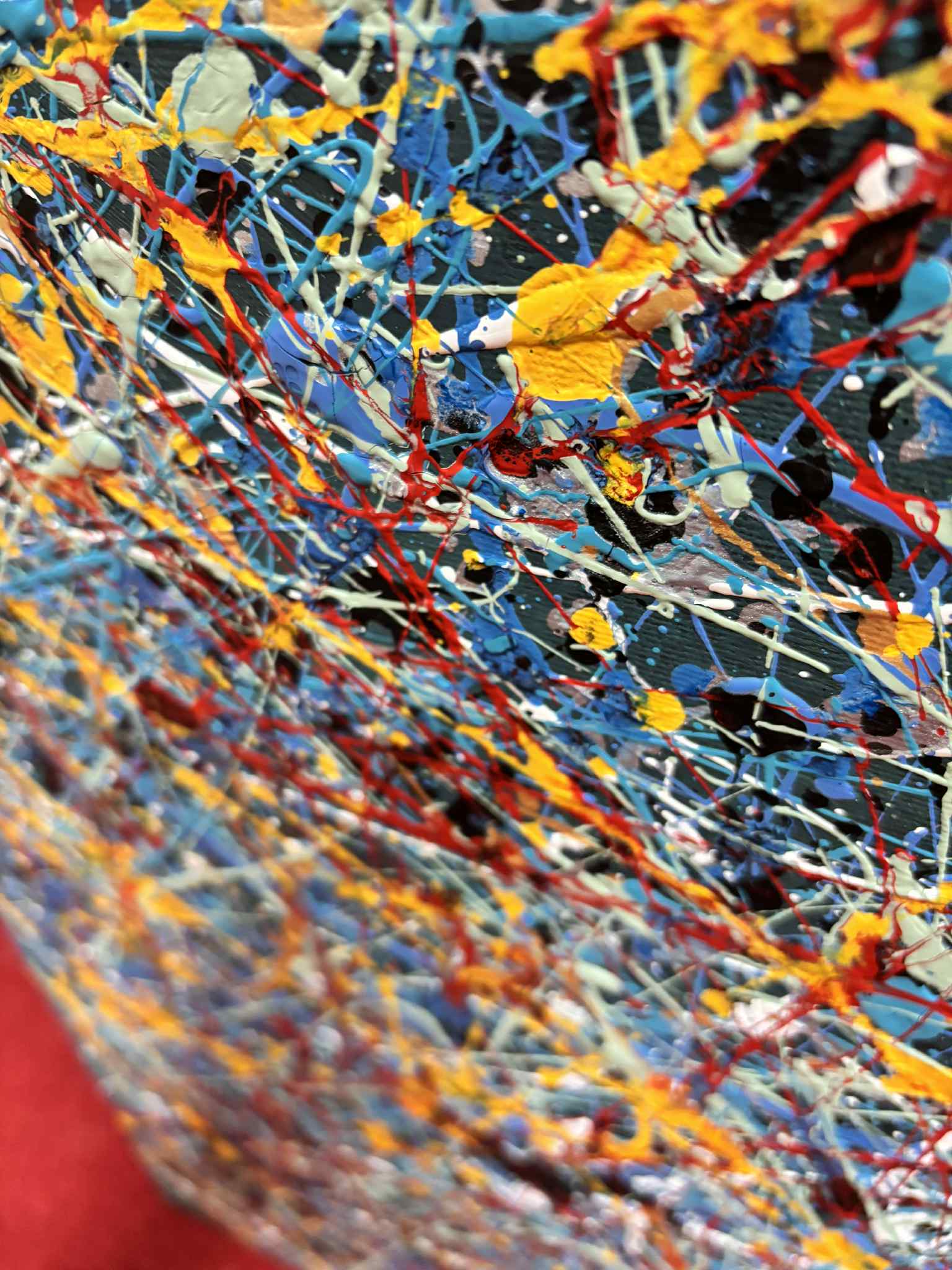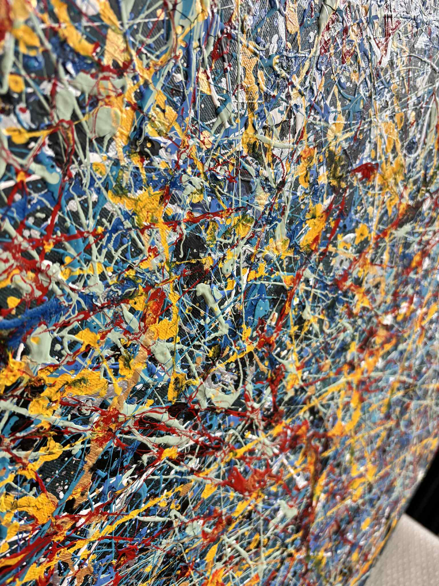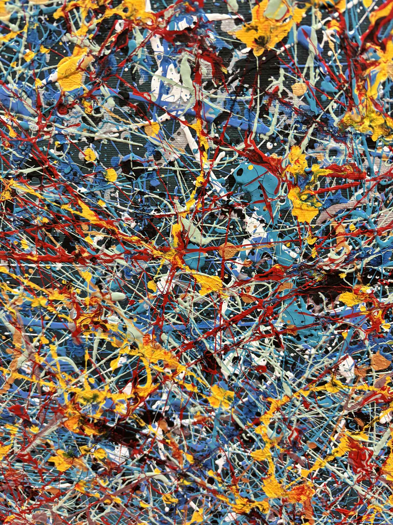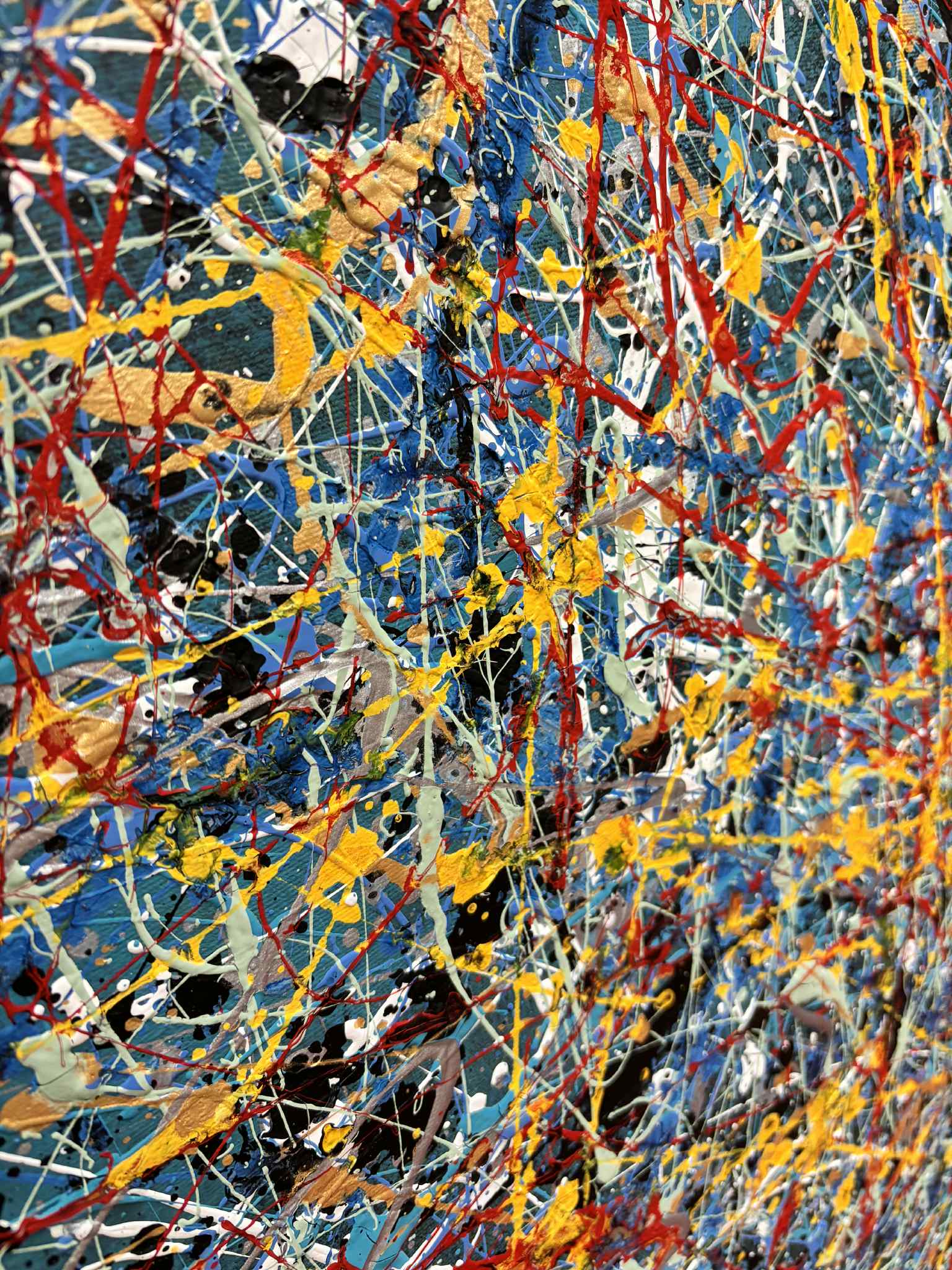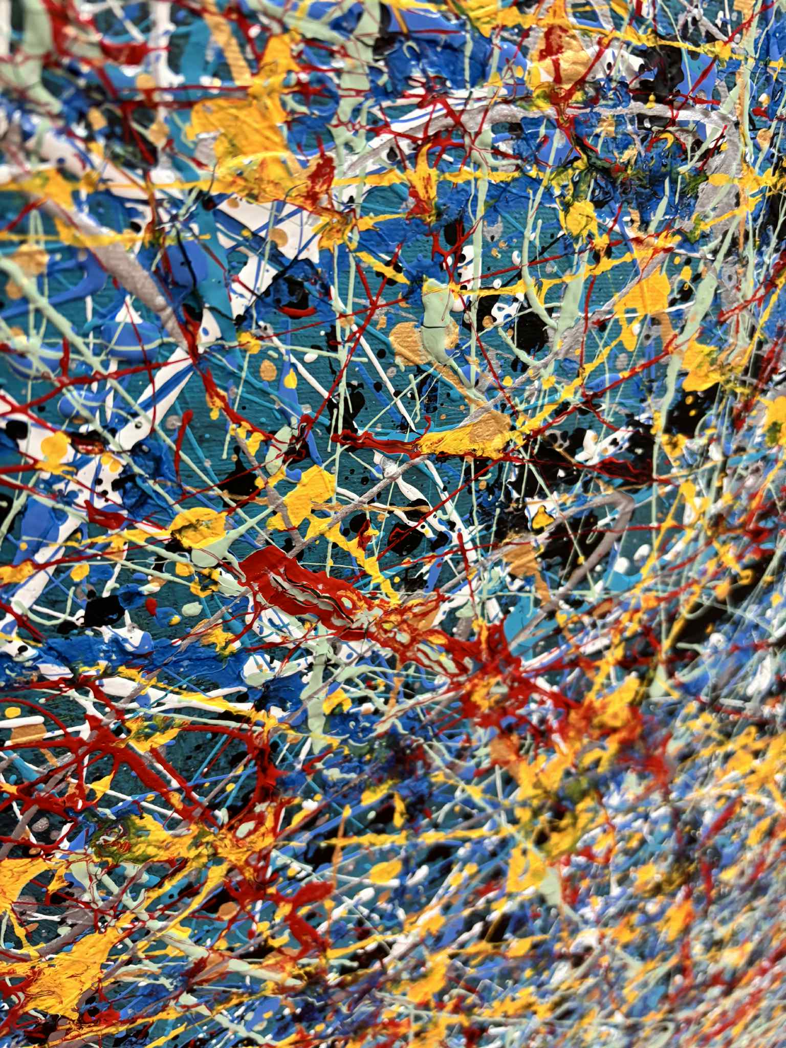 Obraz pulsuje energią czystego gestu. Gęsta sieć dynamicznych linii i spontanicznych rozprysków farby tworzy wielowarstwową strukturę, w której nie ma jednego punktu ciężkości — wzrok wędruje swobodnie, podążając za rytmem koloru i ruchu. Dominujące odcienie chłodnego błękitu i szarości stanowią tło dla żywych akcentów żółci, czerwieni i bieli, które wprowadzają napięcie, światło i emocjonalną intensywność.