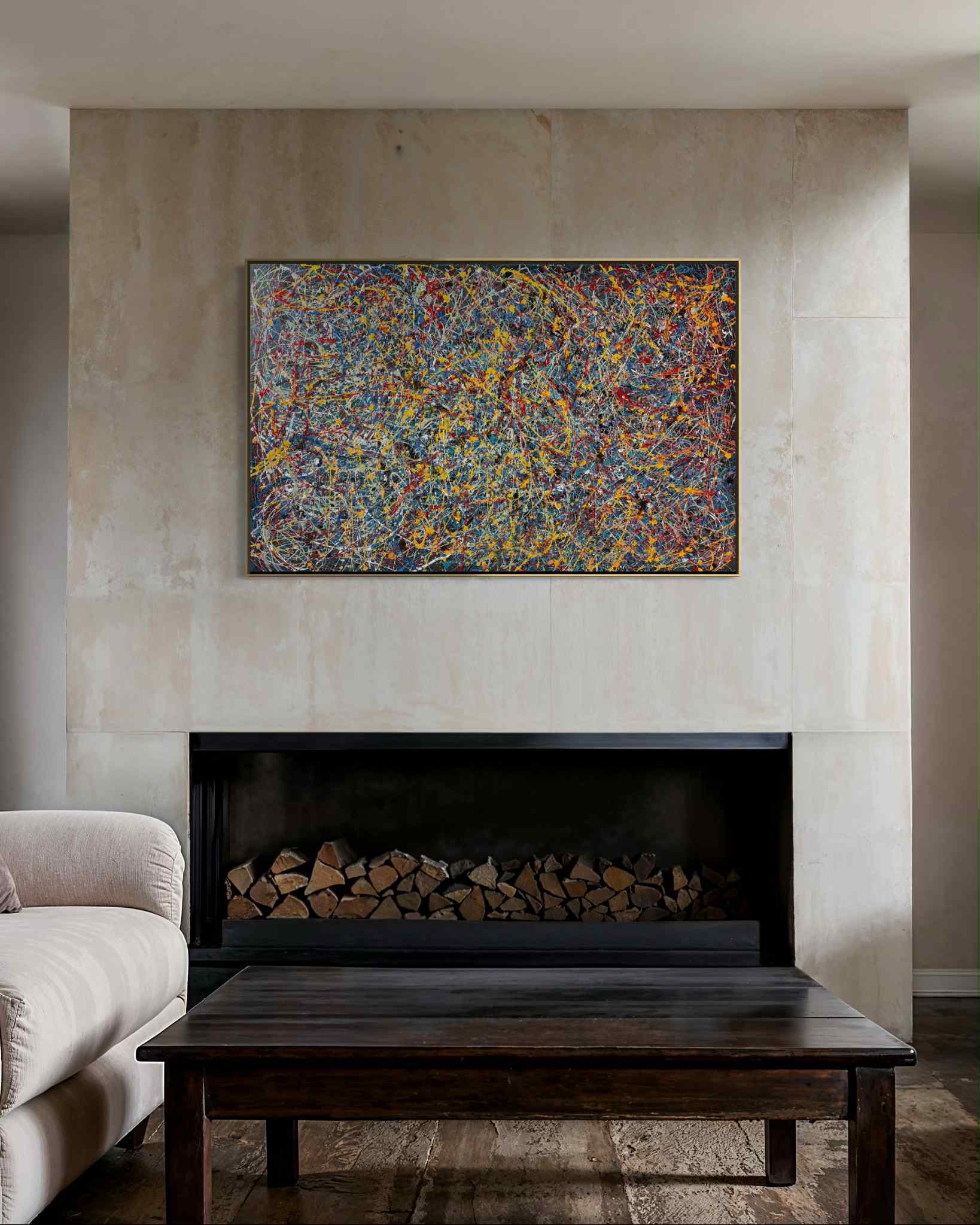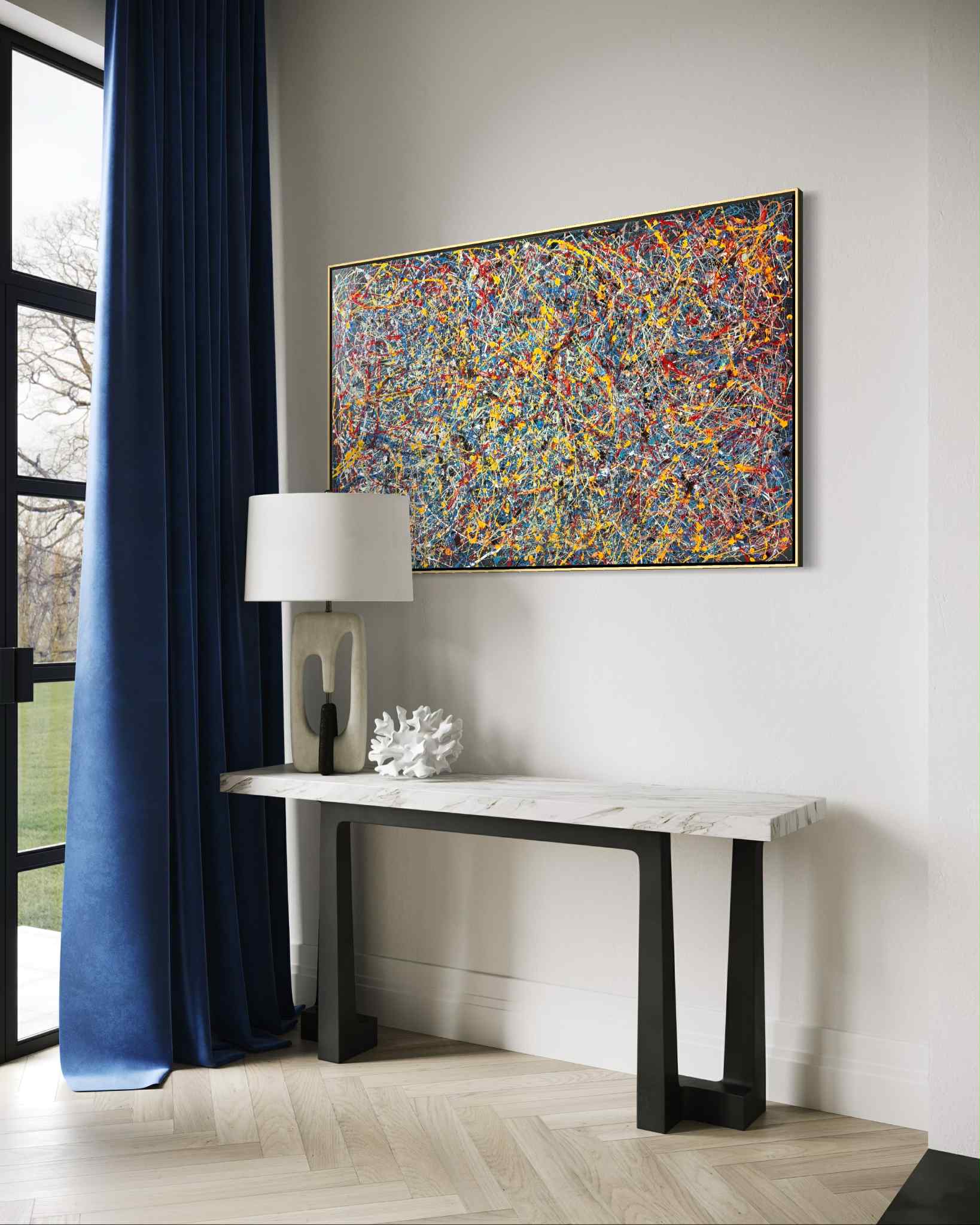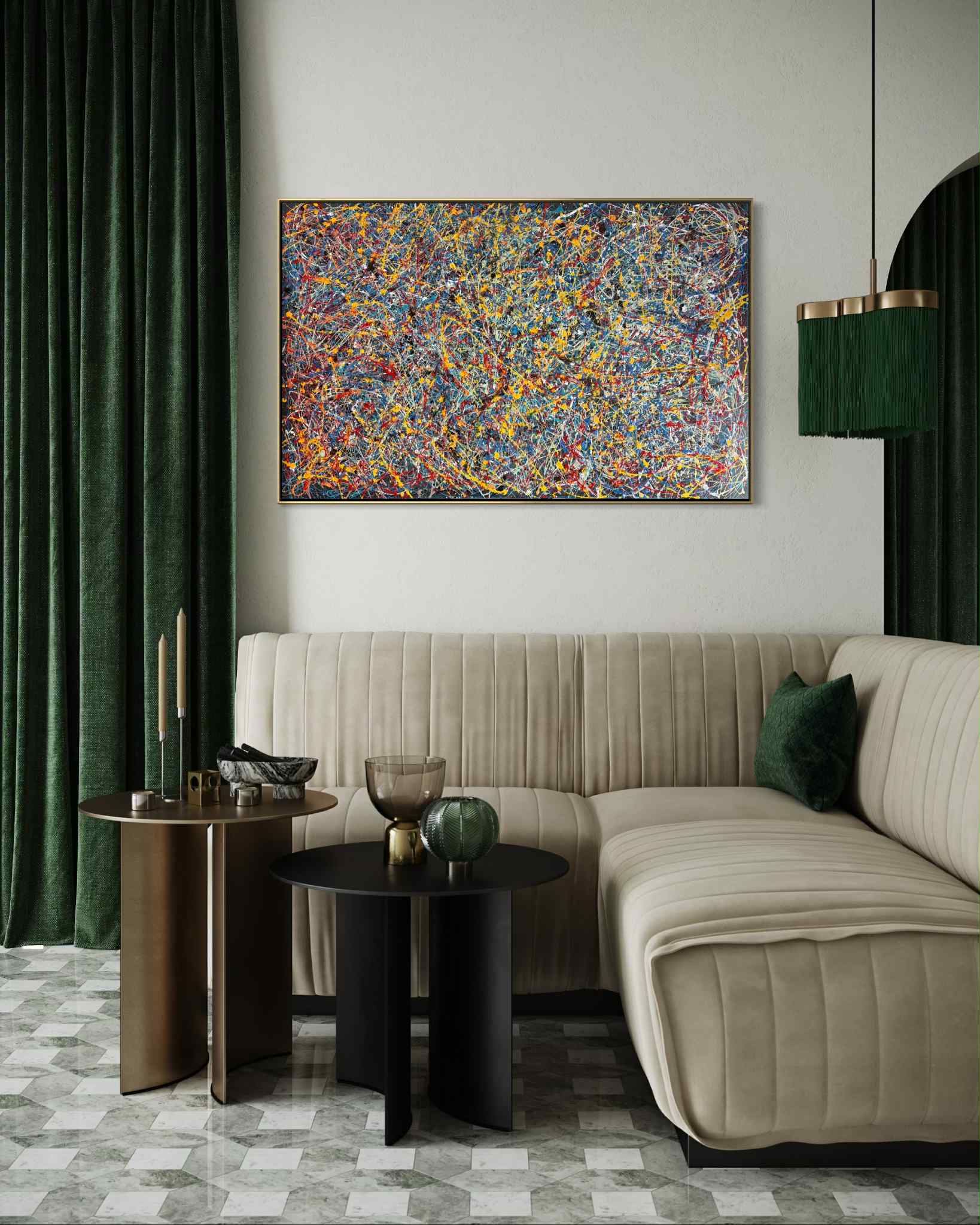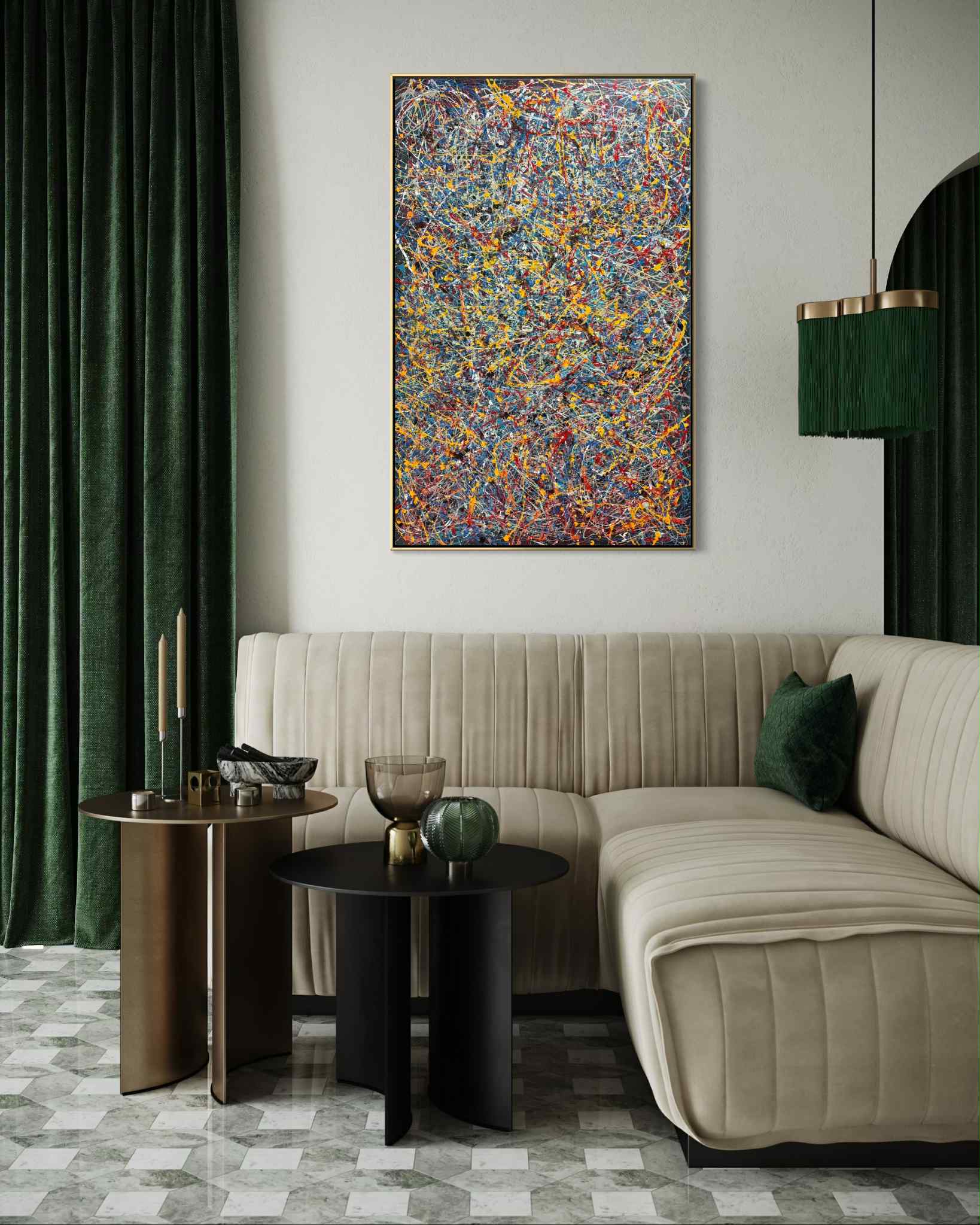Kompozycja przywodzi na myśl zapis energii — jakby obraz był śladem chwili, impulsem zamrożonym w czasie. Chaos jest tu pozorny; w rzeczywistości kryje się w nim wewnętrzna harmonia, balans pomiędzy kontrolą a intuicją. Każda linia wydaje się być odpowiedzią na poprzednią, tworząc wizualny dialog pomiędzy porządkiem a nieprzewidywalnością. To dzieło nie narzuca interpretacji — zaprasza do osobistego odczytania. Może symbolizować intensywność myśli, emocjonalny nadmiar, ale też proces twórczy sam w sobie: moment, w którym energia znajduje ujście i zostaje przekształcona w formę. Obraz wnosi do przestrzeni dynamikę i nowoczesność, stając się mocnym, wyrazistym akcentem, który ożywia wnętrze i przyciąga uwagę, nie tracąc przy tym głębi i elegancji.