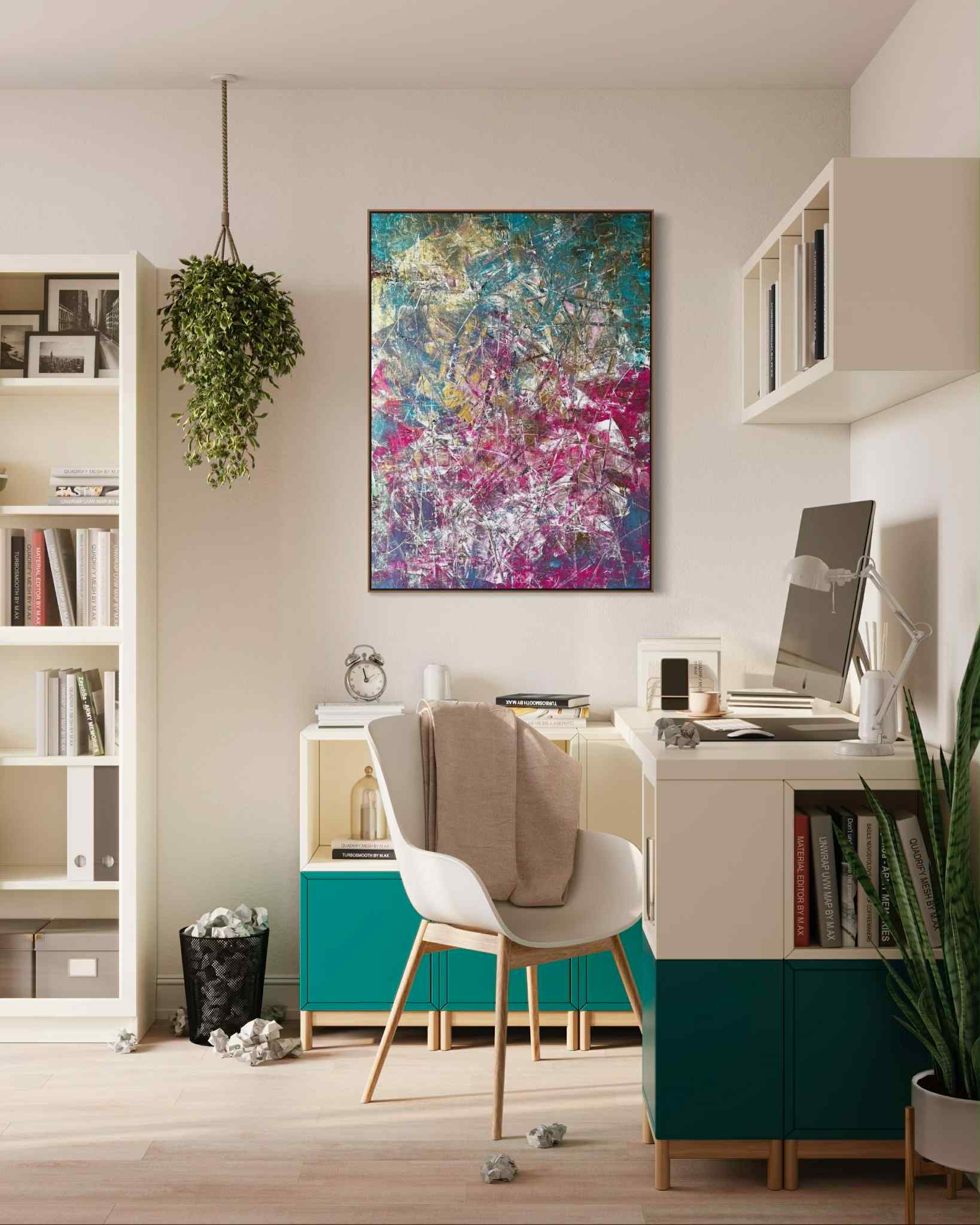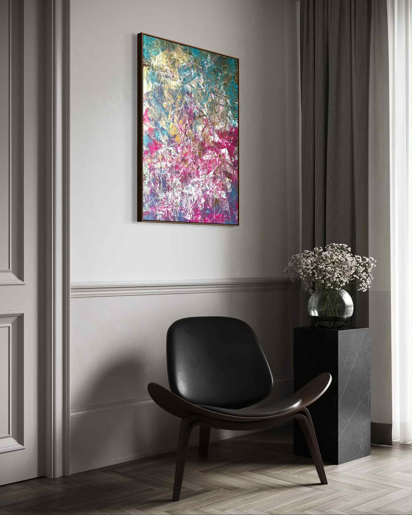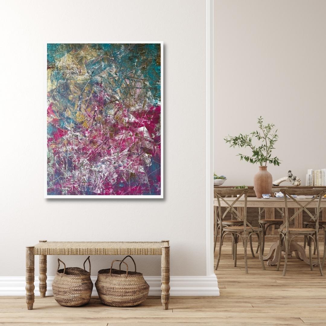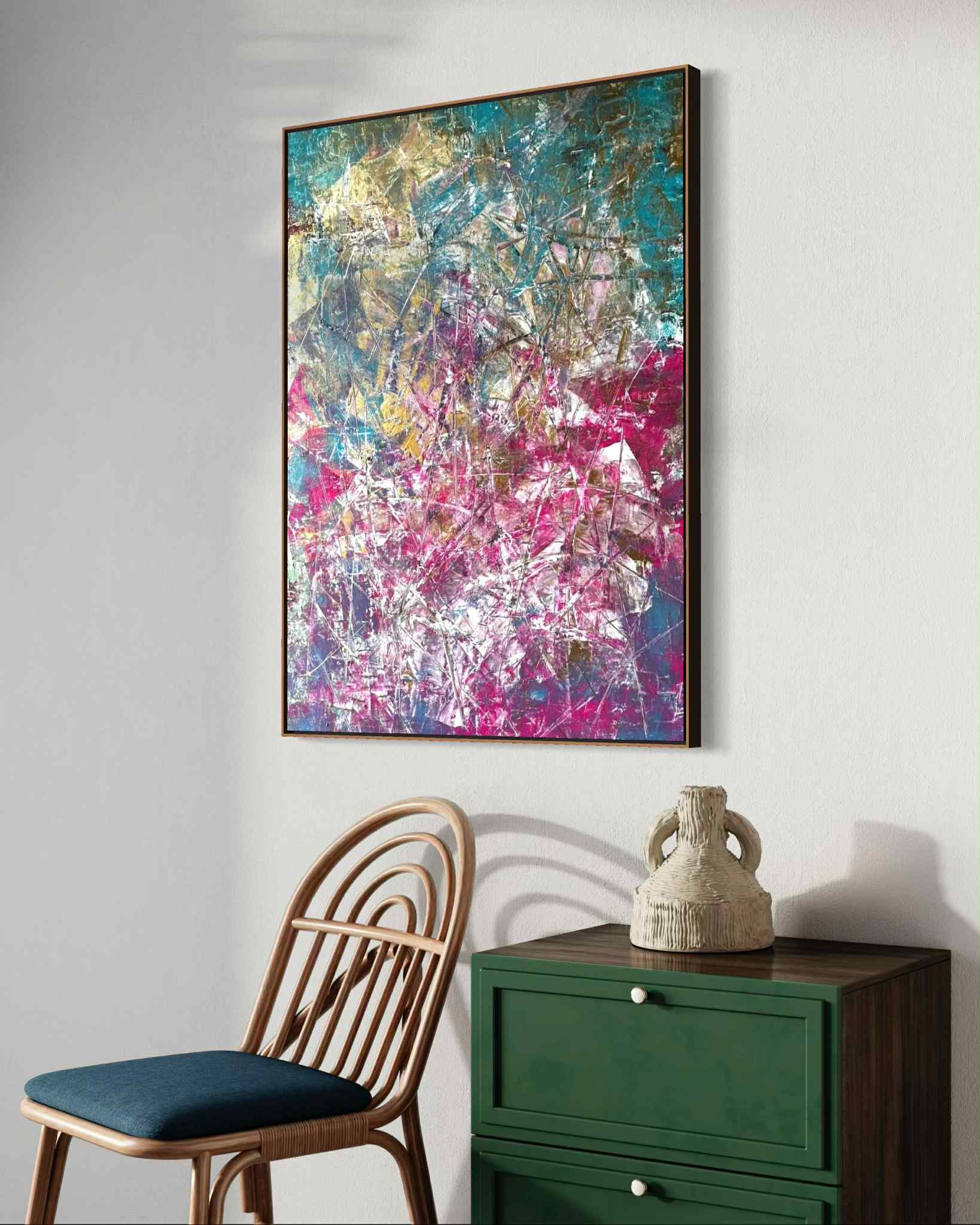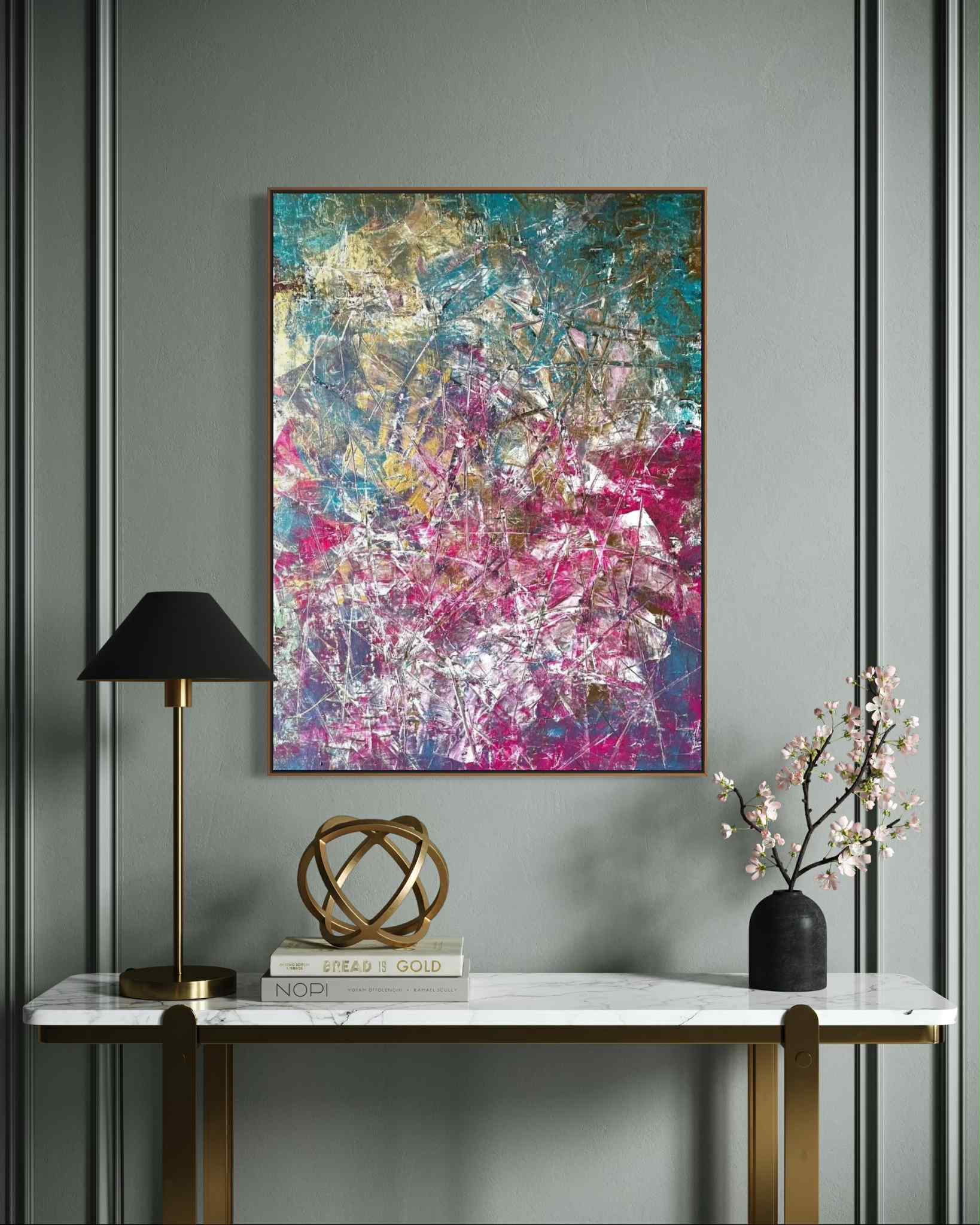 Finezyjne połączenie turkusu, różu i złota. Obraz pięknie połyskuje w świetle. Jego niedoskonałości, zadrapania i skazy to największy atut.