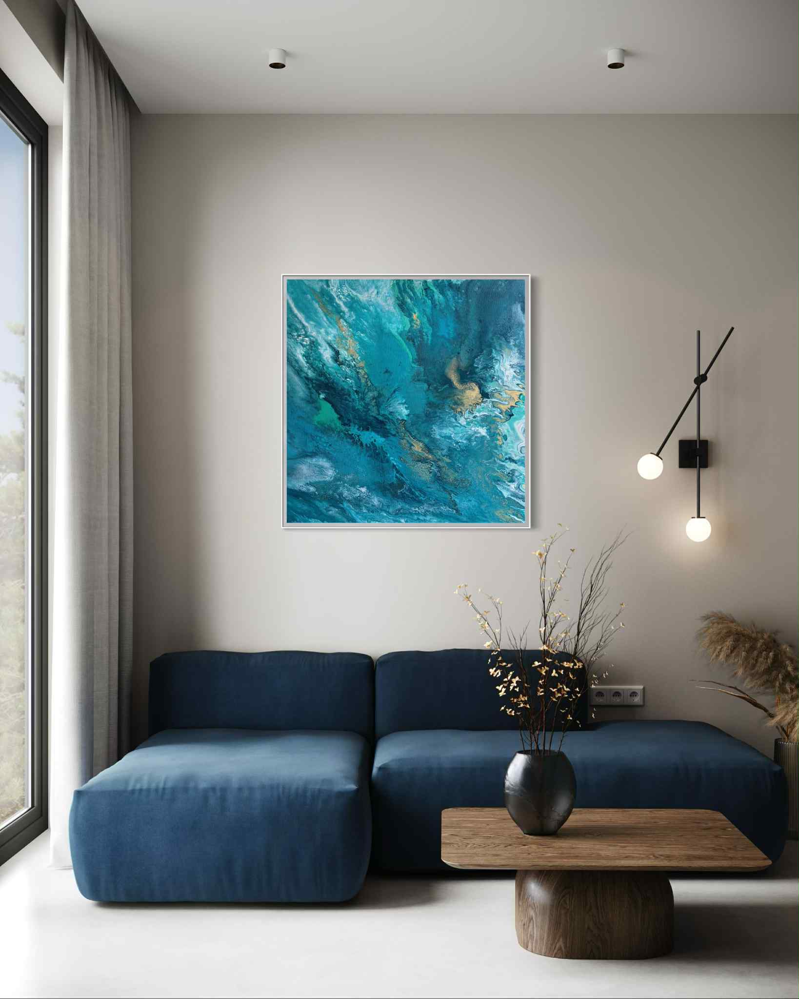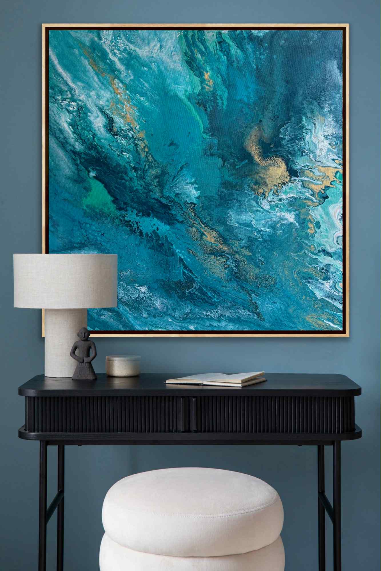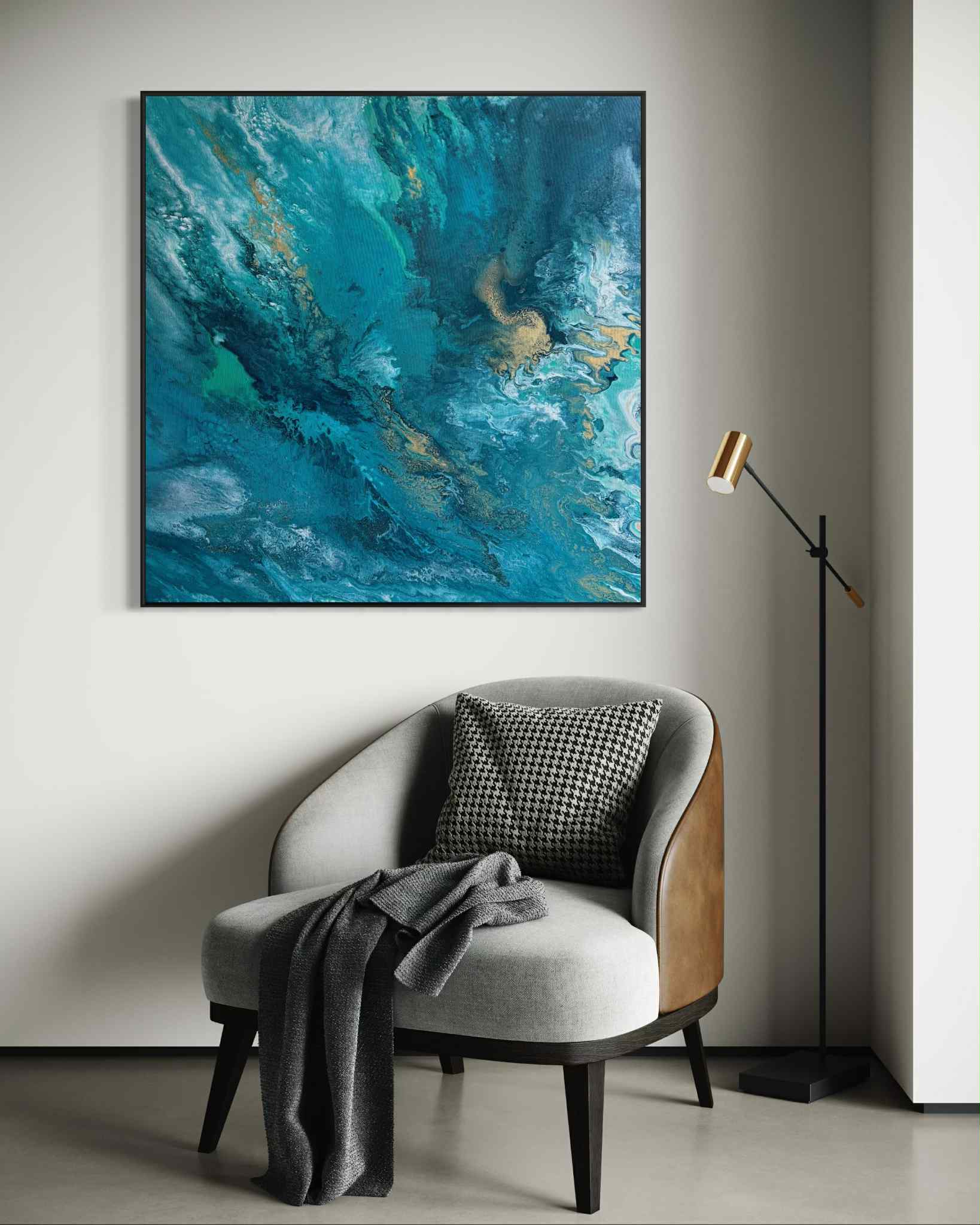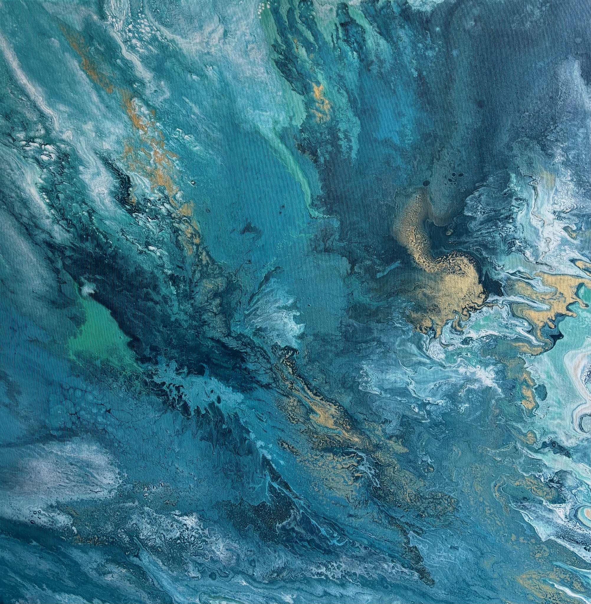 „Zanurzenie” to malarska podróż w głąb żywiołu, w której intensywne odcienie turkusu, głębokiej zieleni i płynącego granatu tworzą wrażenie ruchu, falowania i nieustannego przepływu energii. Kompozycja przypomina moment, w którym patrzymy w głąb oceanu — tam, gdzie światło tańczy na powierzchni, a głębie skrywają swoją własną, spokojną siłę.