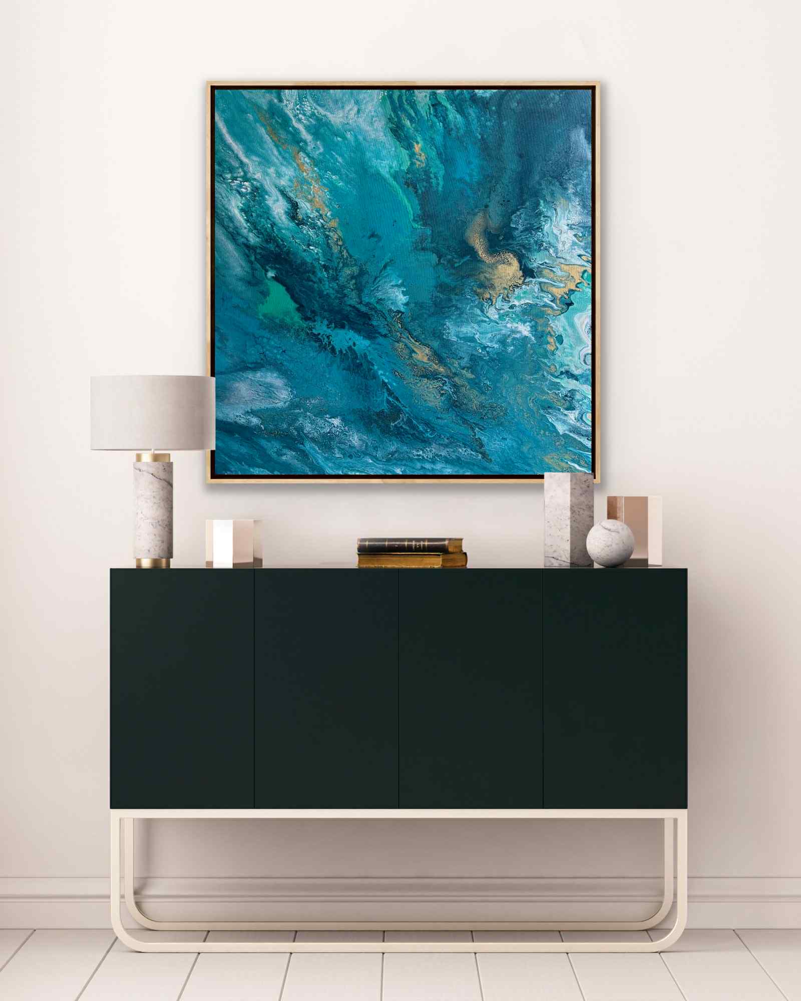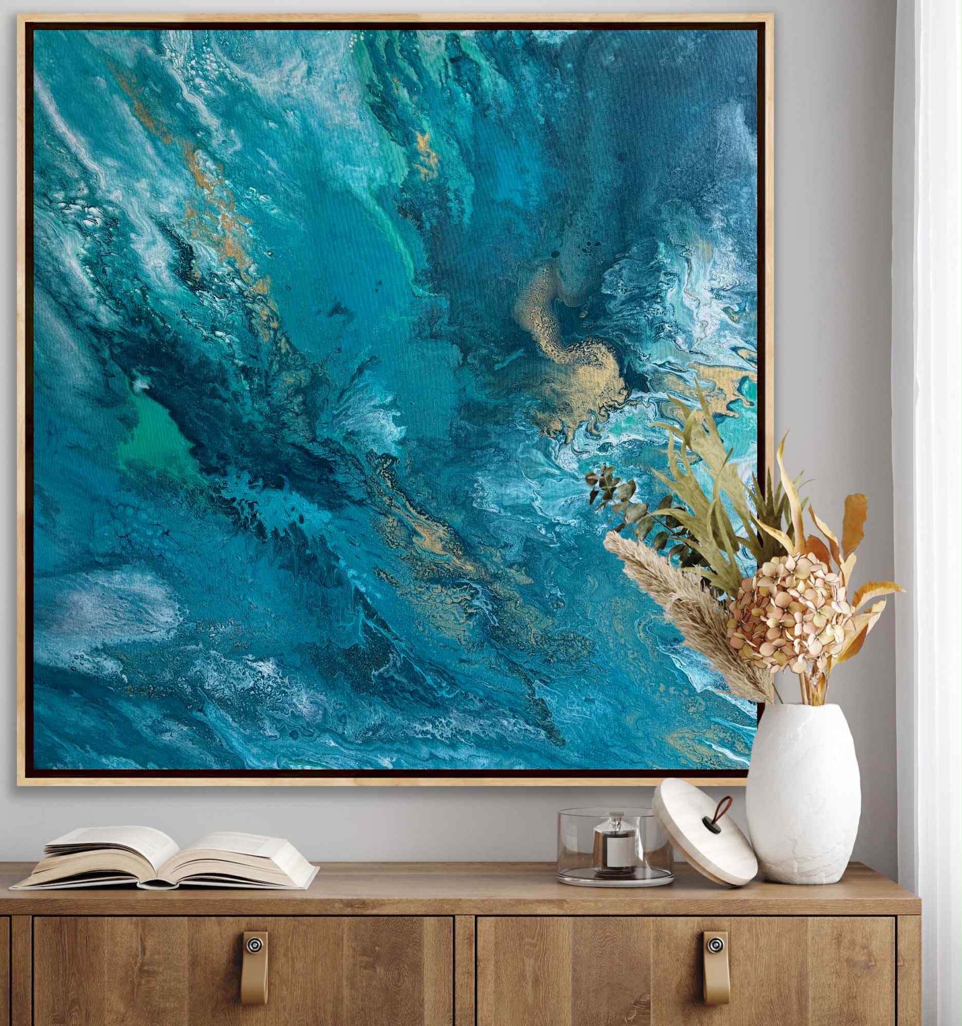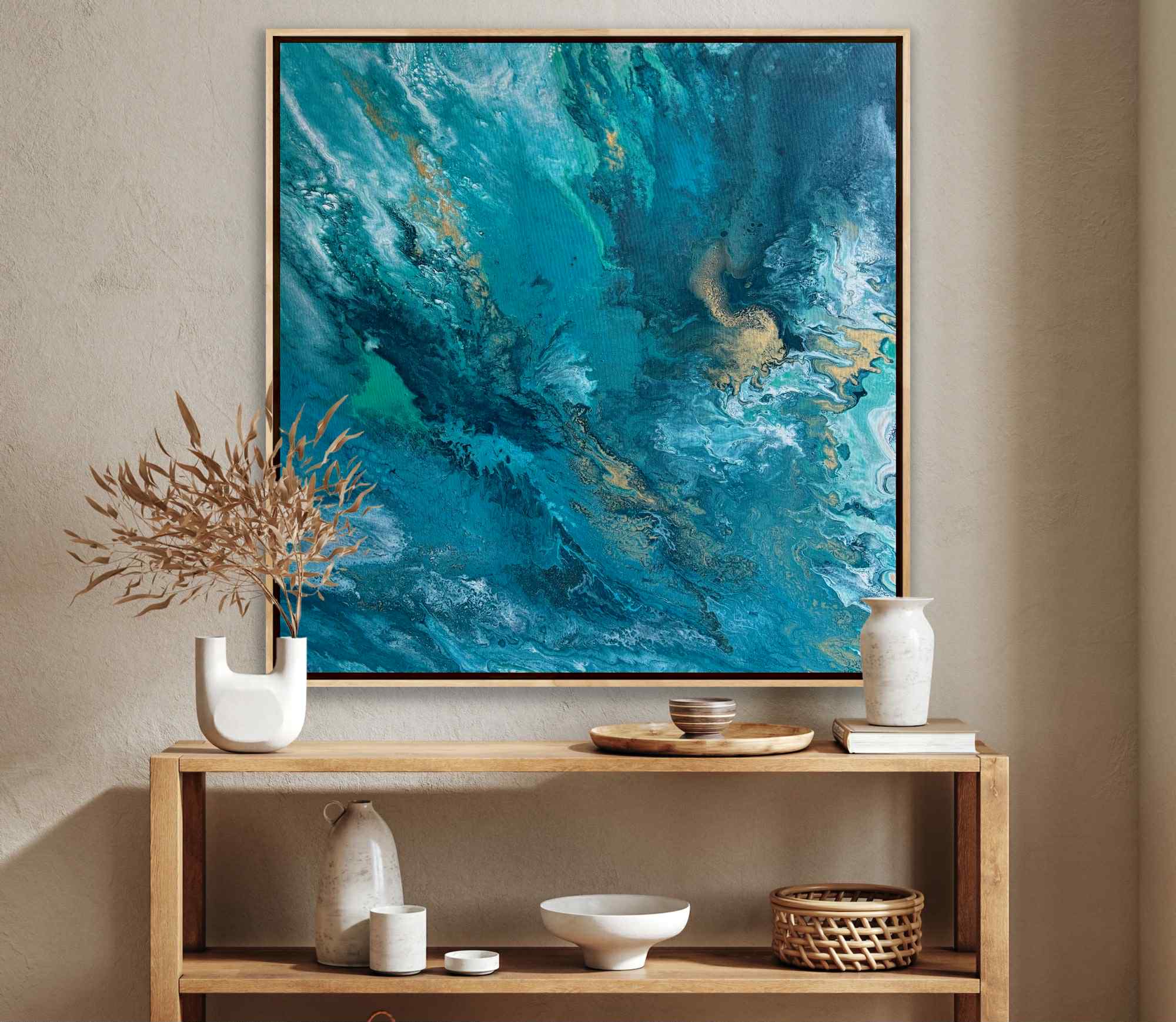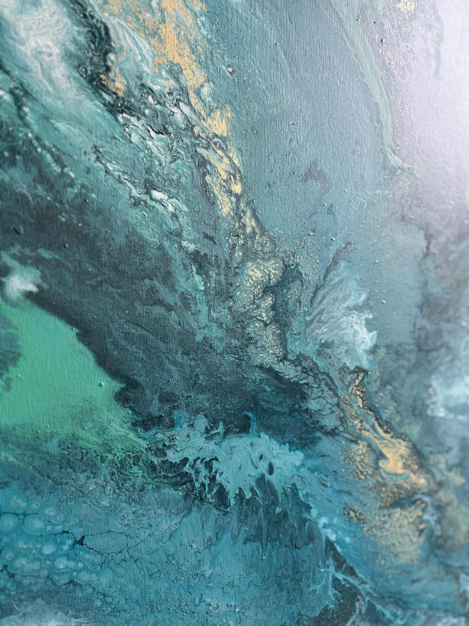 „Zanurzenie” to malarska podróż w głąb żywiołu, w której intensywne odcienie turkusu, głębokiej zieleni i płynącego granatu tworzą wrażenie ruchu, falowania i nieustannego przepływu energii. Kompozycja przypomina moment, w którym patrzymy w głąb oceanu — tam, gdzie światło tańczy na powierzchni, a głębie skrywają swoją własną, spokojną siłę.