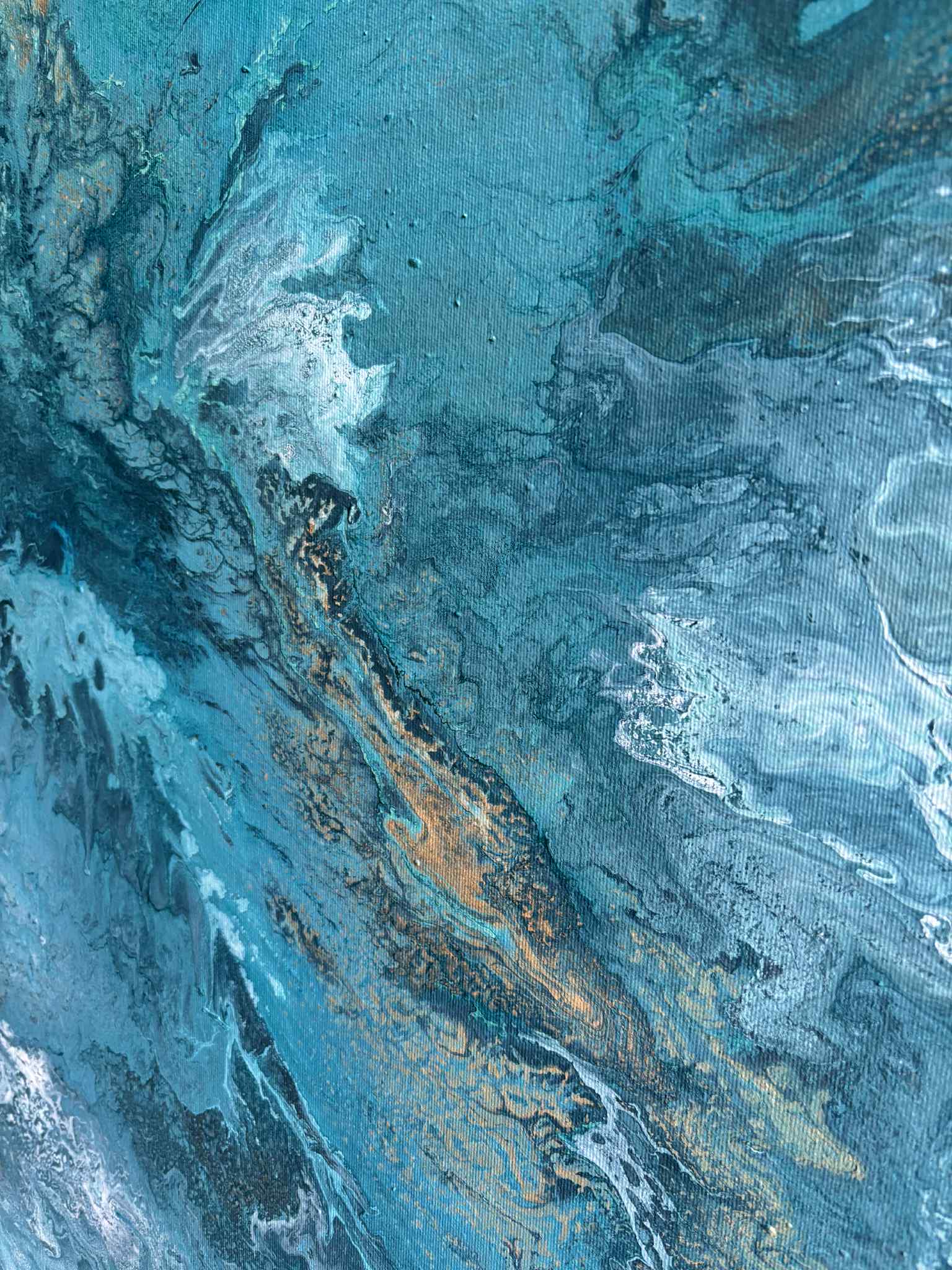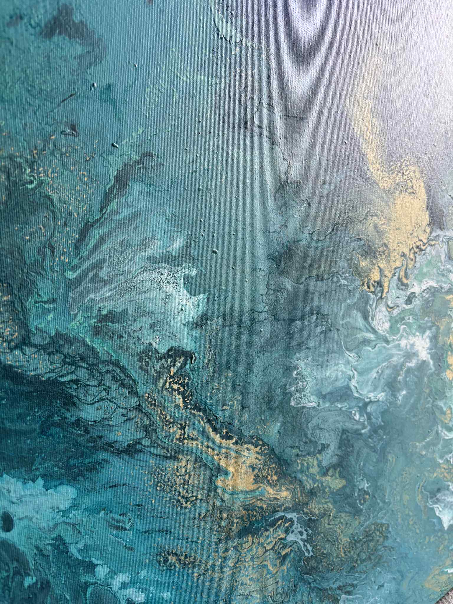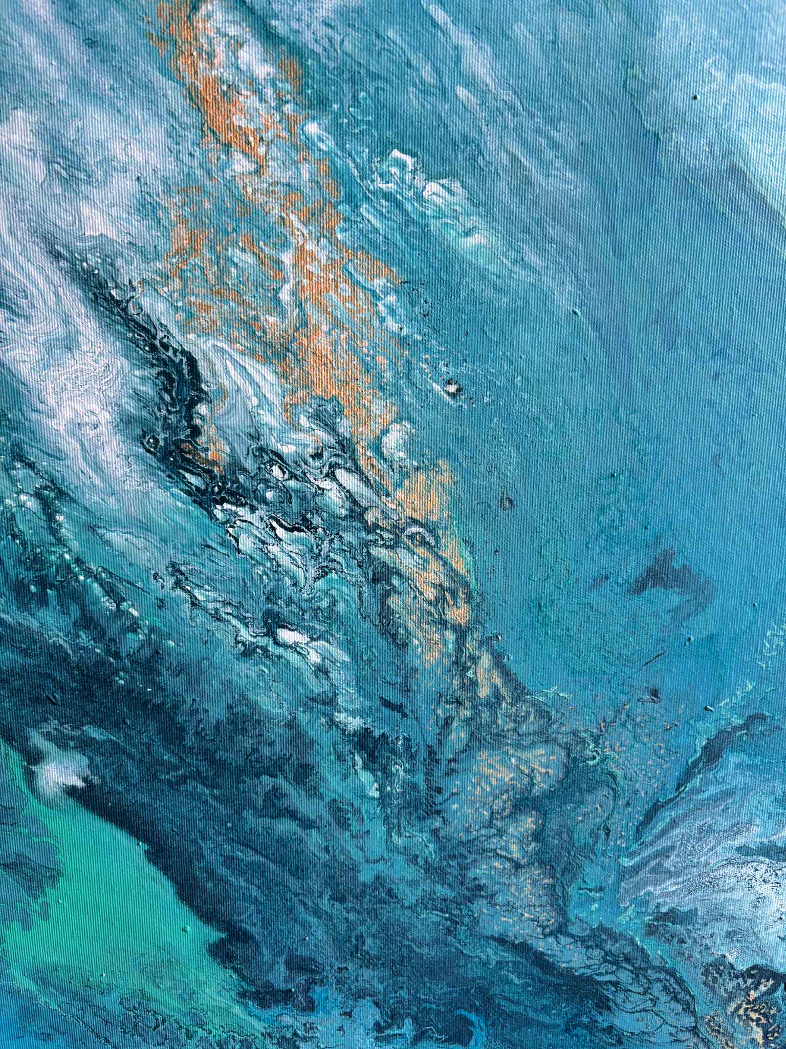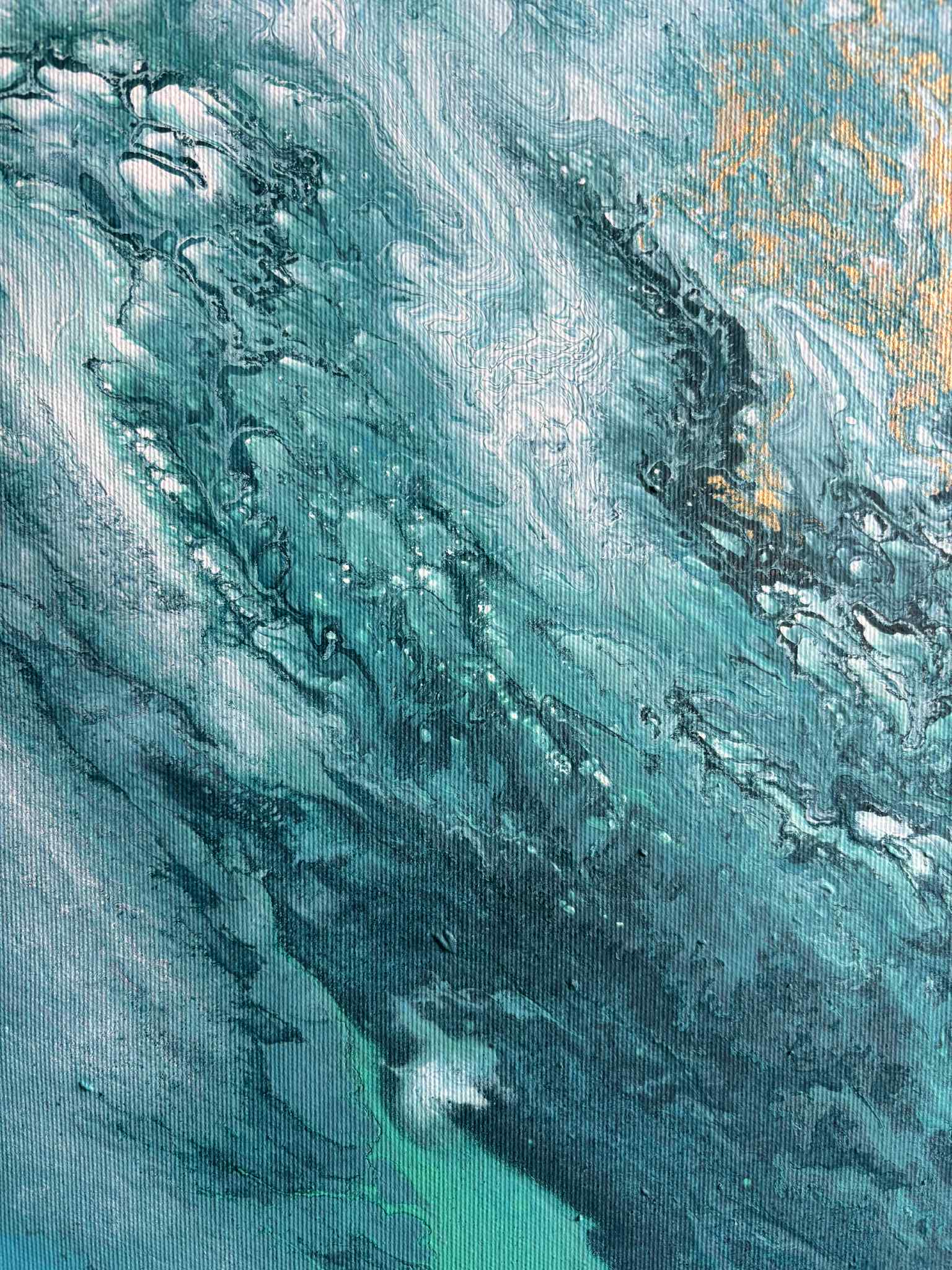 „Zanurzenie” to malarska podróż w głąb żywiołu, w której intensywne odcienie turkusu, głębokiej zieleni i płynącego granatu tworzą wrażenie ruchu, falowania i nieustannego przepływu energii. Kompozycja przypomina moment, w którym patrzymy w głąb oceanu — tam, gdzie światło tańczy na powierzchni, a głębie skrywają swoją własną, spokojną siłę.