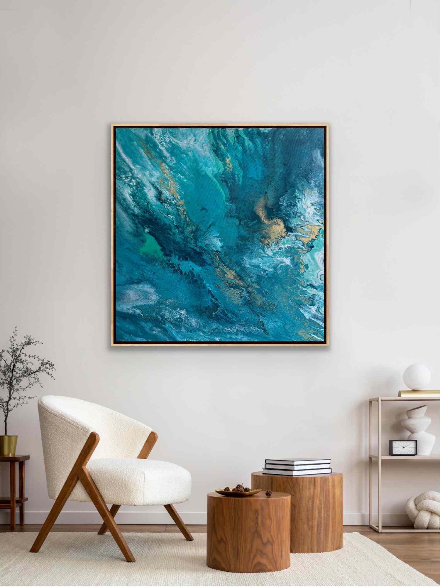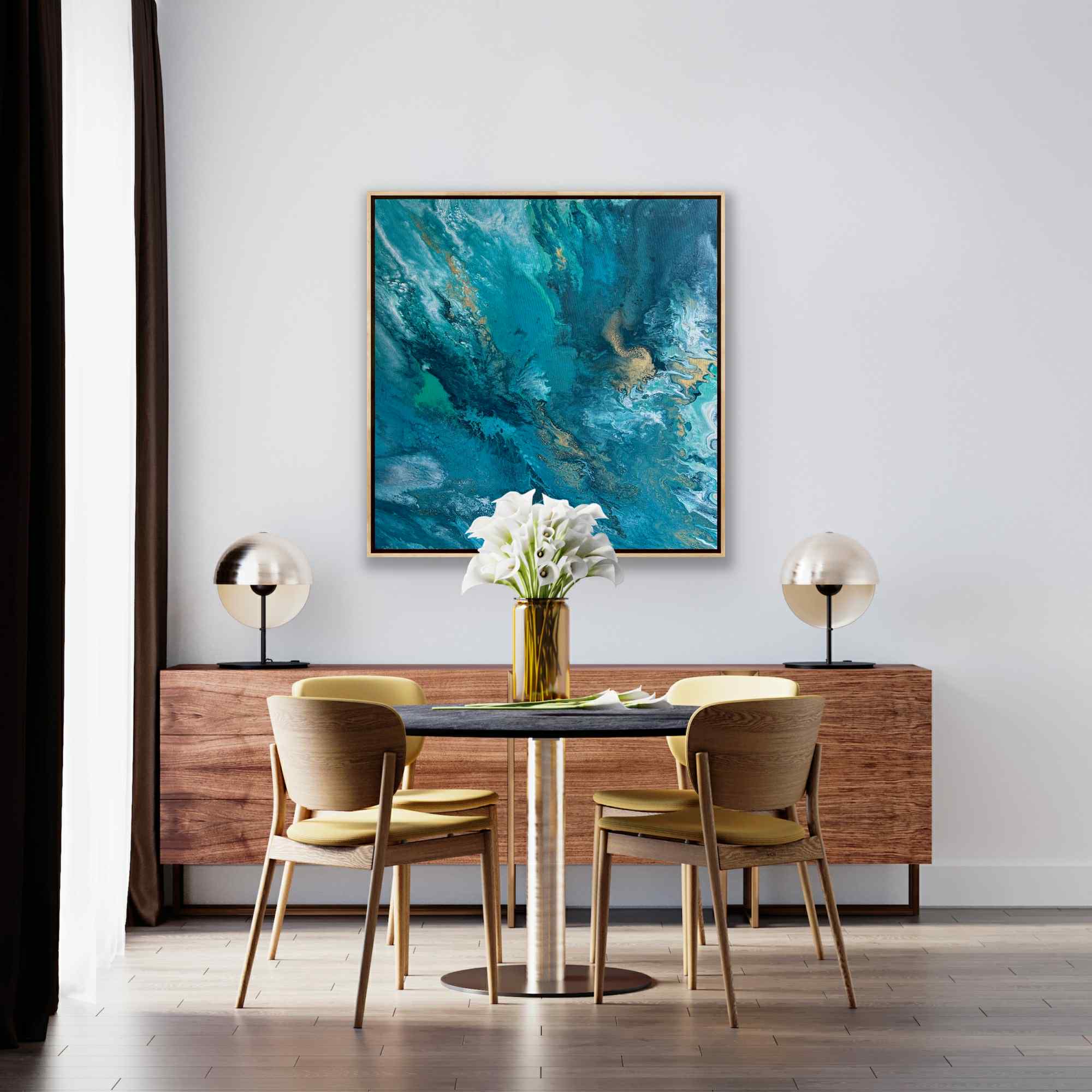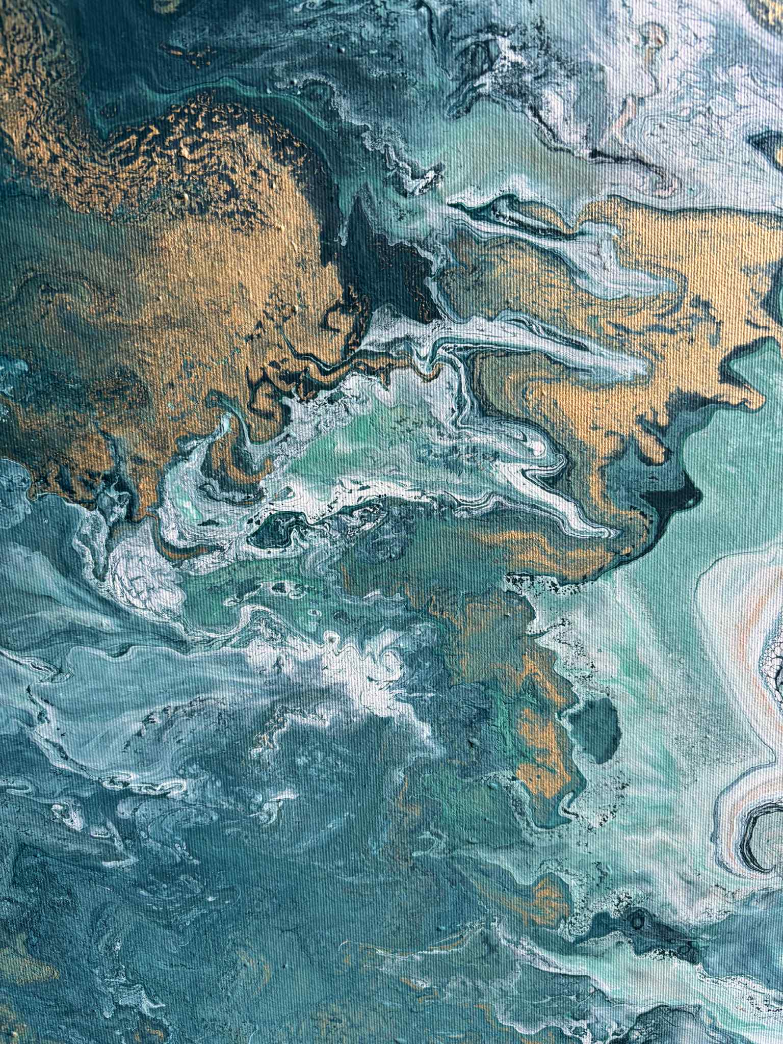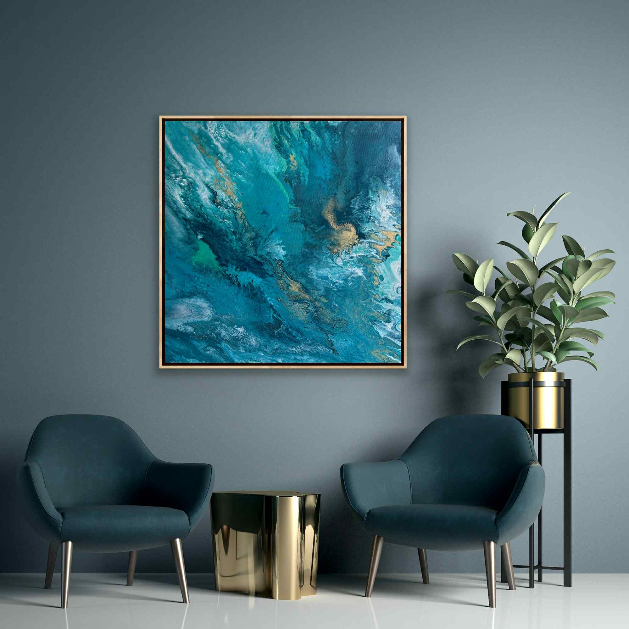 „Zanurzenie” to malarska podróż w głąb żywiołu, w której intensywne odcienie turkusu, głębokiej zieleni i płynącego granatu tworzą wrażenie ruchu, falowania i nieustannego przepływu energii. Kompozycja przypomina moment, w którym patrzymy w głąb oceanu — tam, gdzie światło tańczy na powierzchni, a głębie skrywają swoją własną, spokojną siłę.
