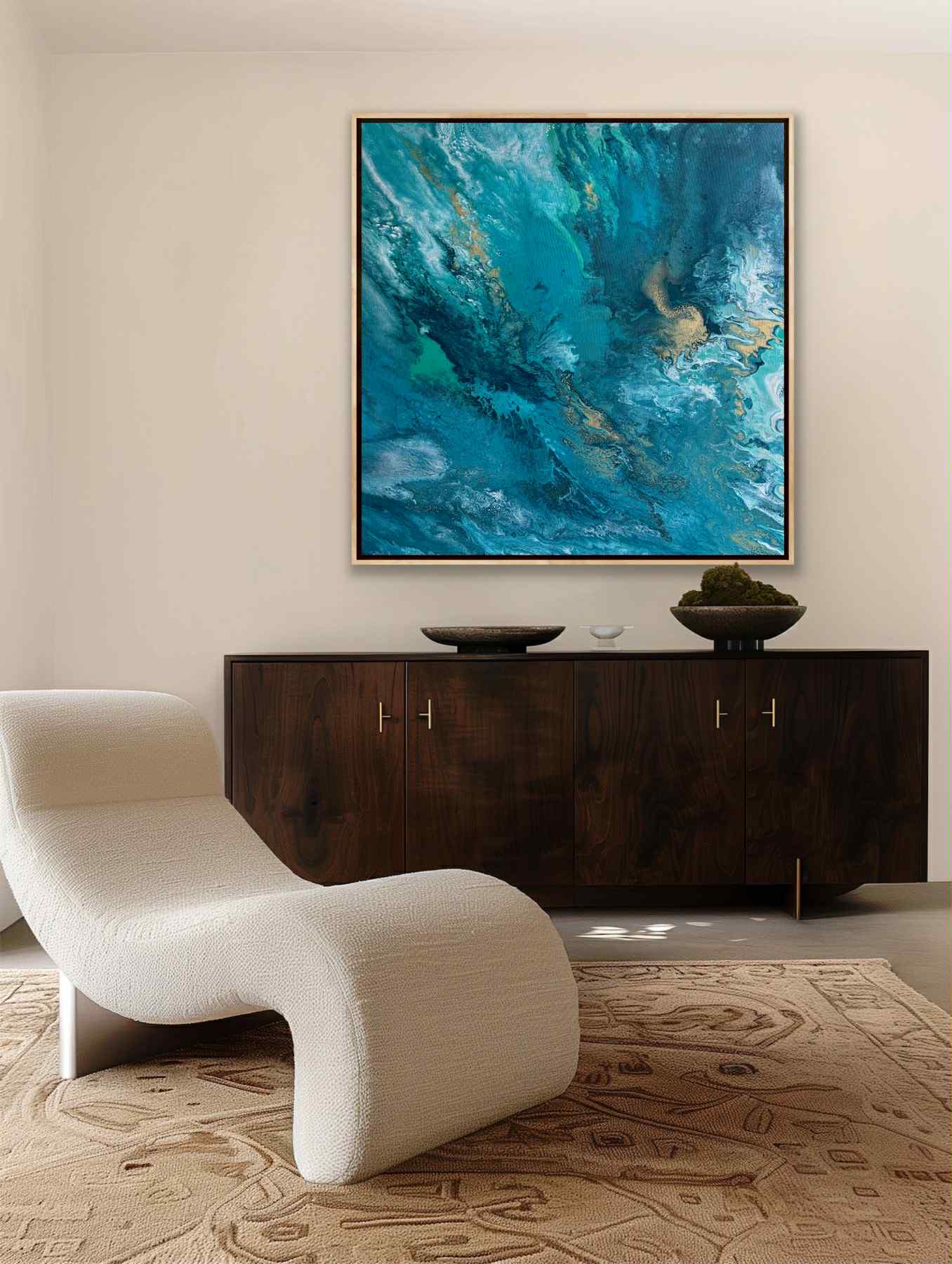 Dynamiczne linie i rozmyte przejścia barw nadają obrazowi wrażenie swobodnego unoszenia się, jakby widz naprawdę zanurzał się w nurcie, pozwalając, by woda prowadziła go tam, gdzie panuje cisza i czyste odczuwanie. Subtelne złotawe refleksy dodają całości lekkości i szlachetności, jak promień słońca przenikający przez falę.